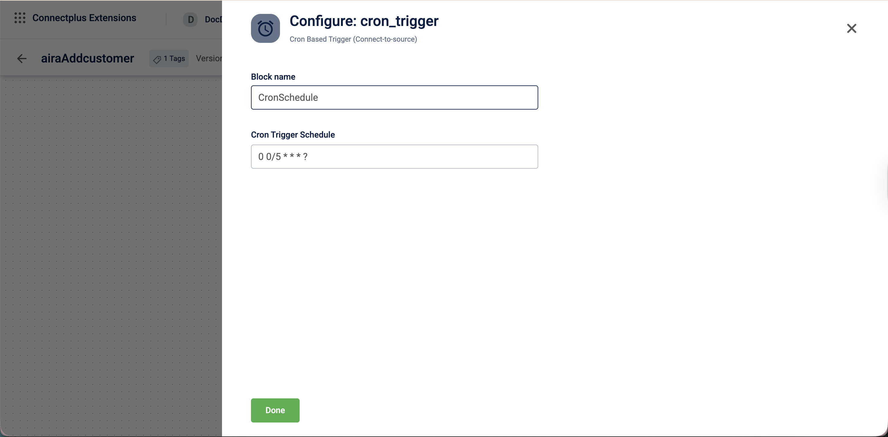 The cron_trigger block schedules a dataflow to run automatically at defined time intervals using a cron expression in a Connect+ dataflow. It acts as the trigger that initiates the dataflow pipeline at the configured schedule.
