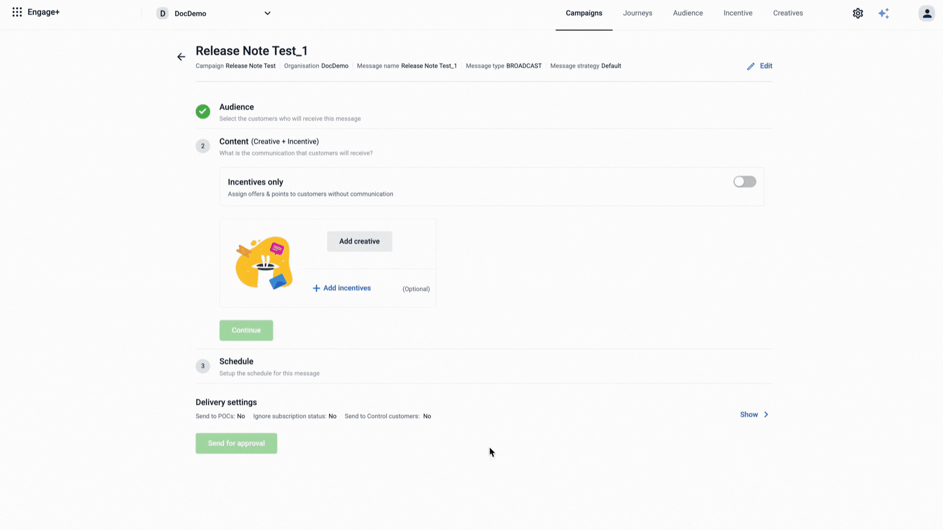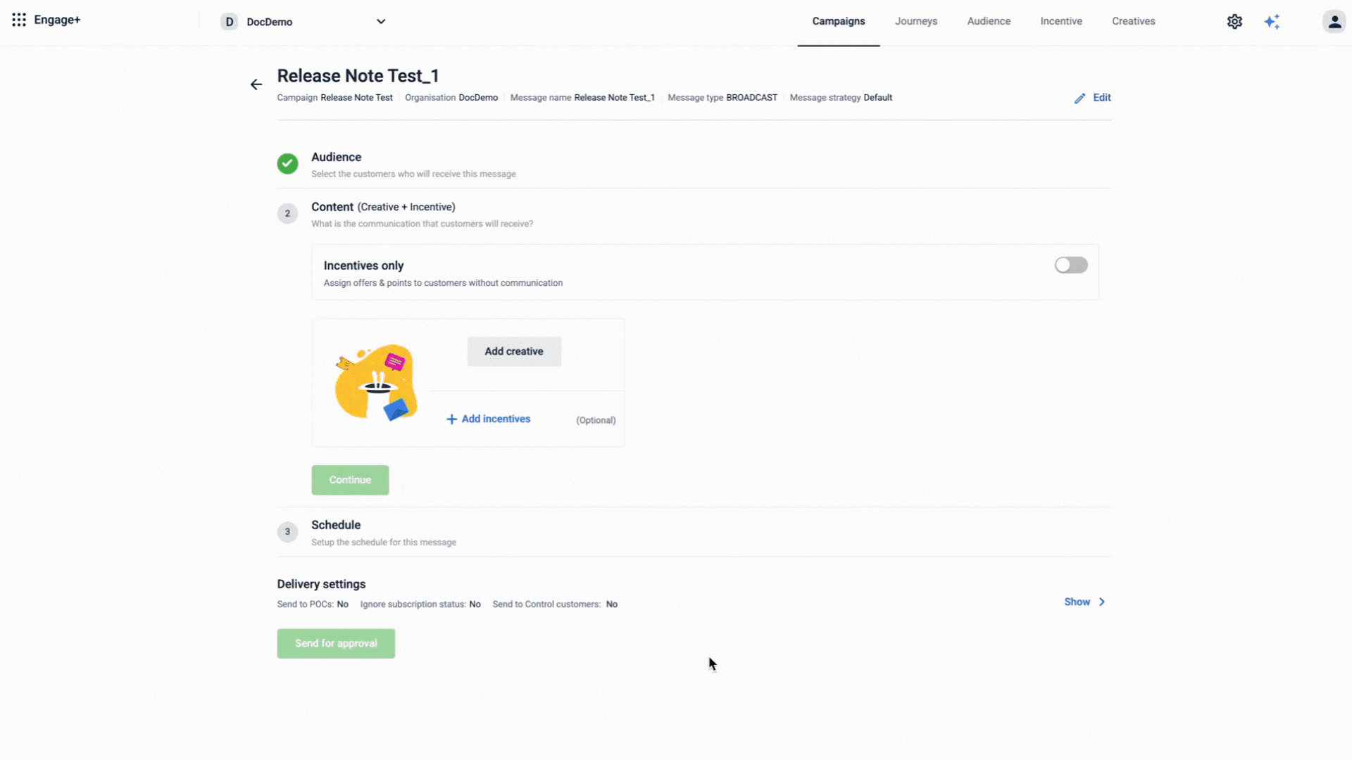- In the Content section, select Add Creative and choose your desired engagement channel.