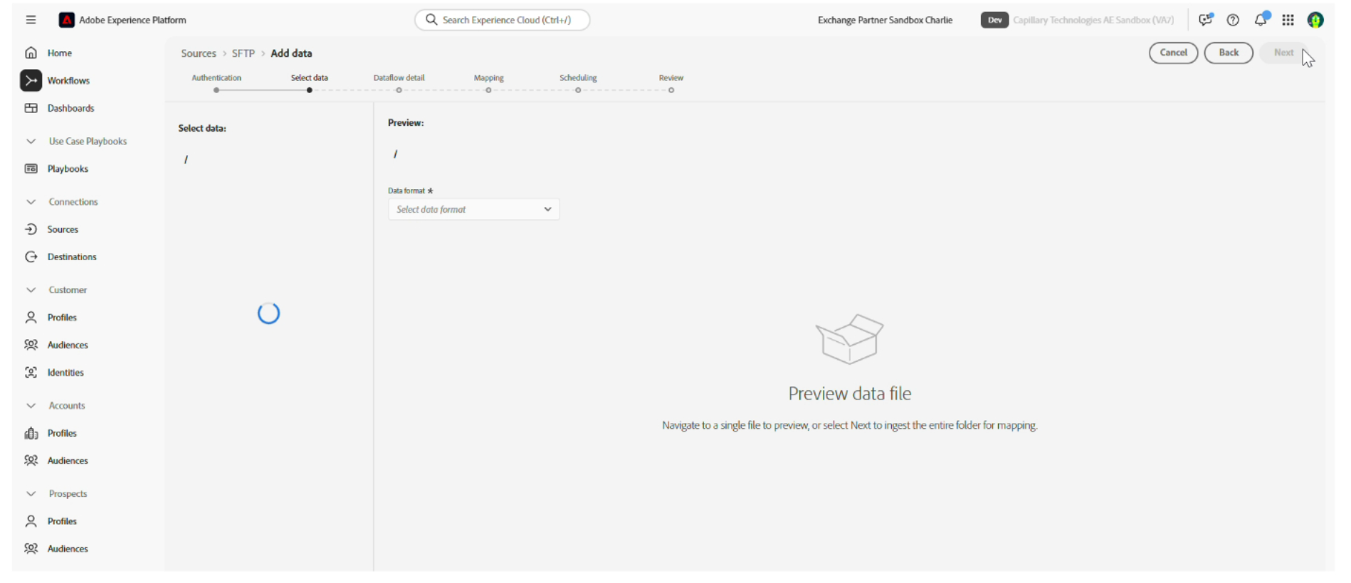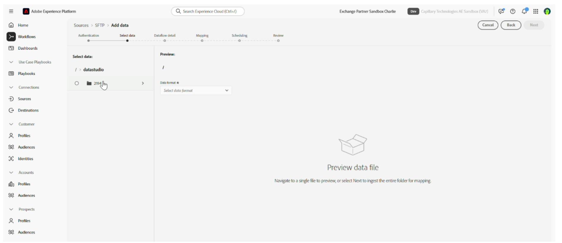 In AEP, go to Sources and add or select your SFTP account > specify the repository and folder containing the exported files and click** Next**.
