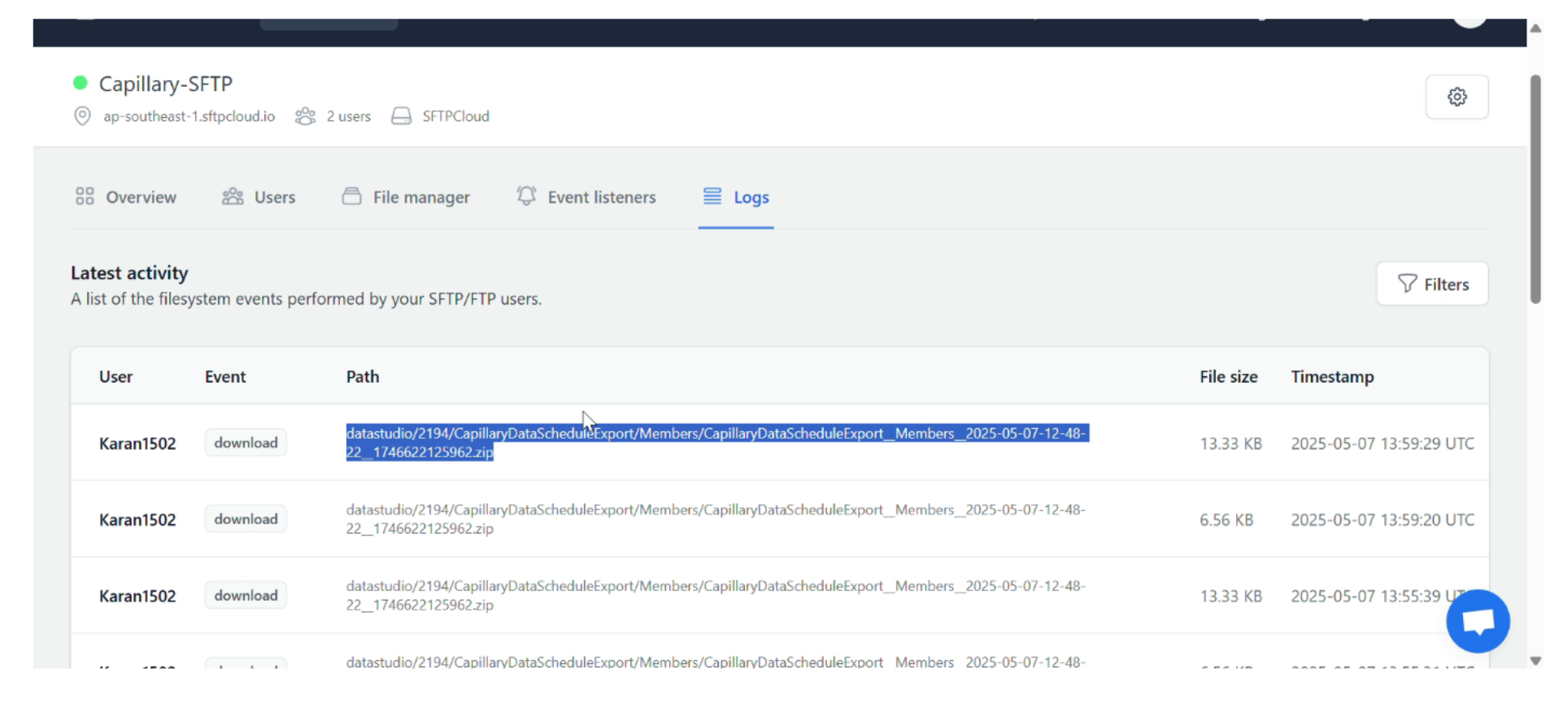 Check the status of your export schedule in your SFTP. The application displays if a transfer is completed. Review logs to verify the file path and details. Exported data arrives as a ZIP file.