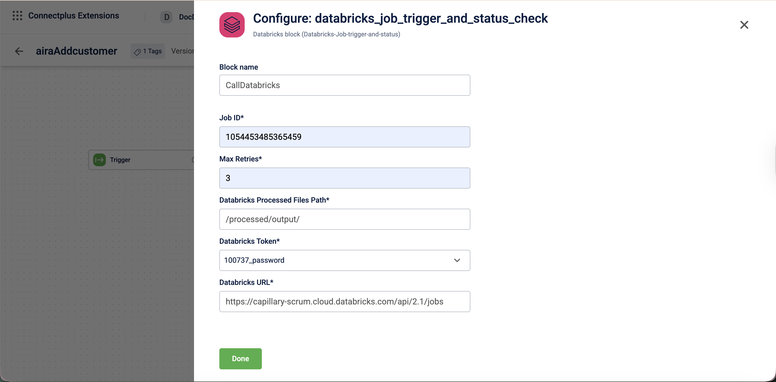 The databricks_job_trigger_and_status_check block triggers a pre-existing Databricks notebook job and monitors its completion status. It acts as a transformation block in a Connect+ dataflow, used to validate and process incoming data before passing it to downstream blocks. The block authenticates with the Databricks API using a personal access token, stores processed files at a specified path, and retries status checks until the job completes or reaches the maximum retry limit.
