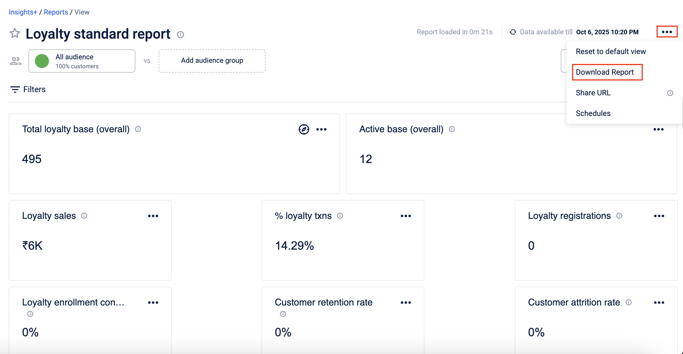 You can download a report to an Excel sheet for offline analysis. Both standard and custom reports are available for download. The downloaded report includes the entire dataset, including segment-level data for each KPI and the filters applied.