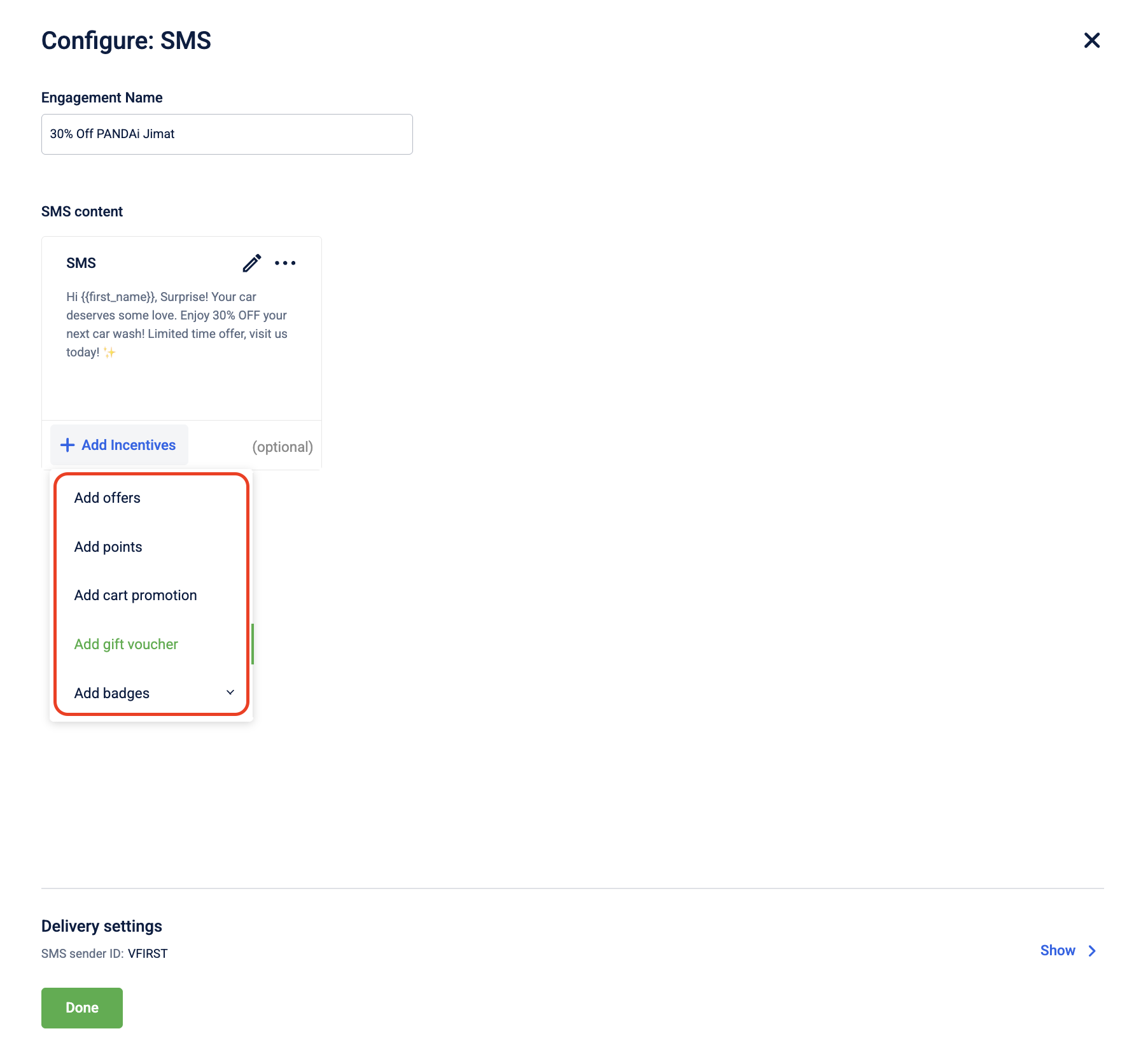 - To add incentives along with the engagement message, click +Add incentives and add desired incentives. Currently offers, points, cart promotions, gift vouchers and badges are the Incentives supported in Journeys. For more information on how to add incentives, see Add incentives.