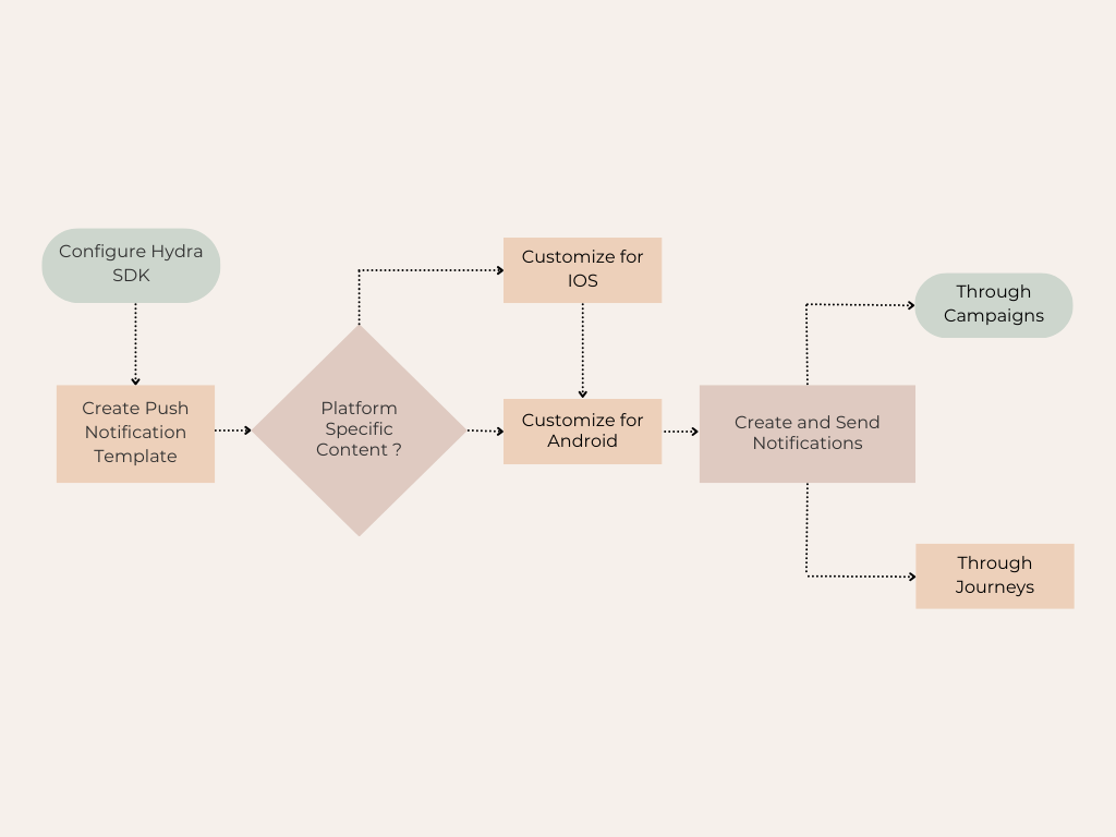 - Creating and Sending Push Notifications in Campaigns and Journeys- Push notifications can be added to both Campaigns and Journeys to engage users. In Campaigns, they promote products and drive engagement, while in Journeys, they send personalized prompts as users progress.