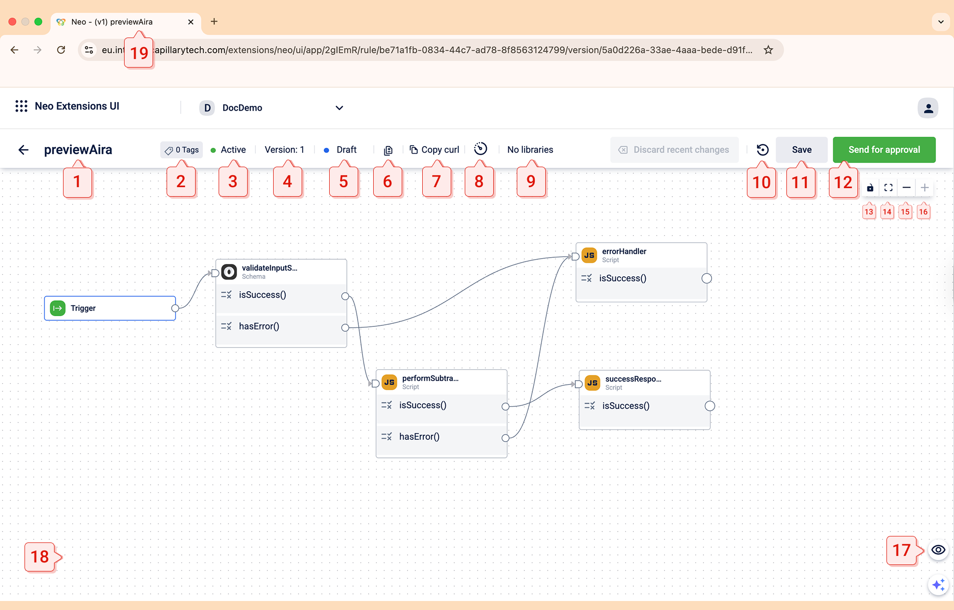 19 | Name (Tab Name) | Displays the name of the dataflow within the browser tab. This allows you to organise and view multiple dataflows tabs in the browser. |
