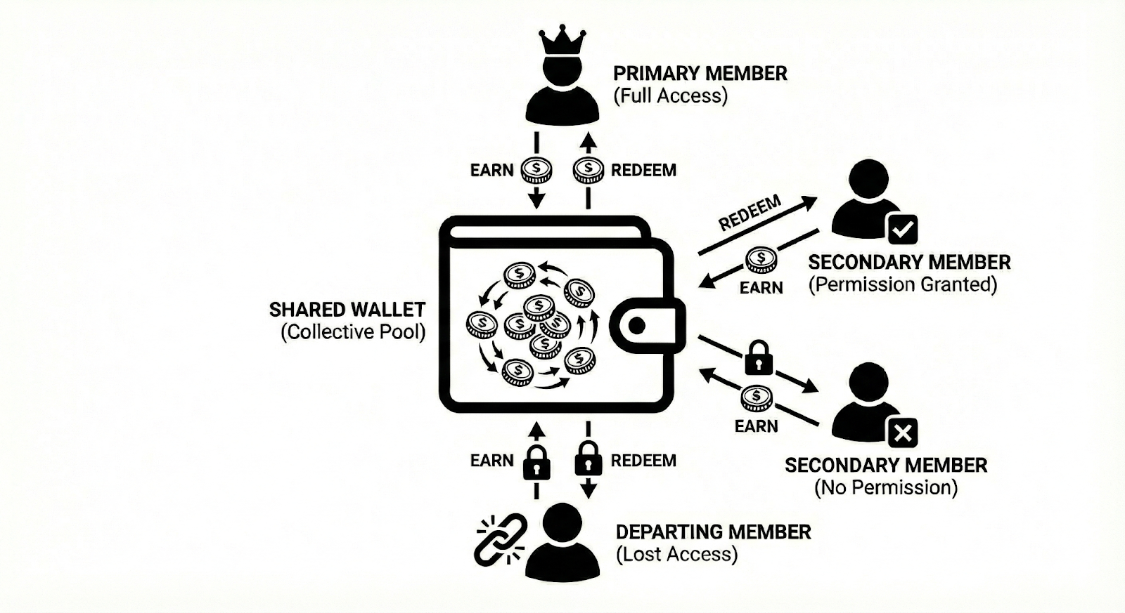 All earned points are deposited into one central group wallet. No per-member separation exists. Members with redemption permission can spend the full balance, regardless of how much they contributed.