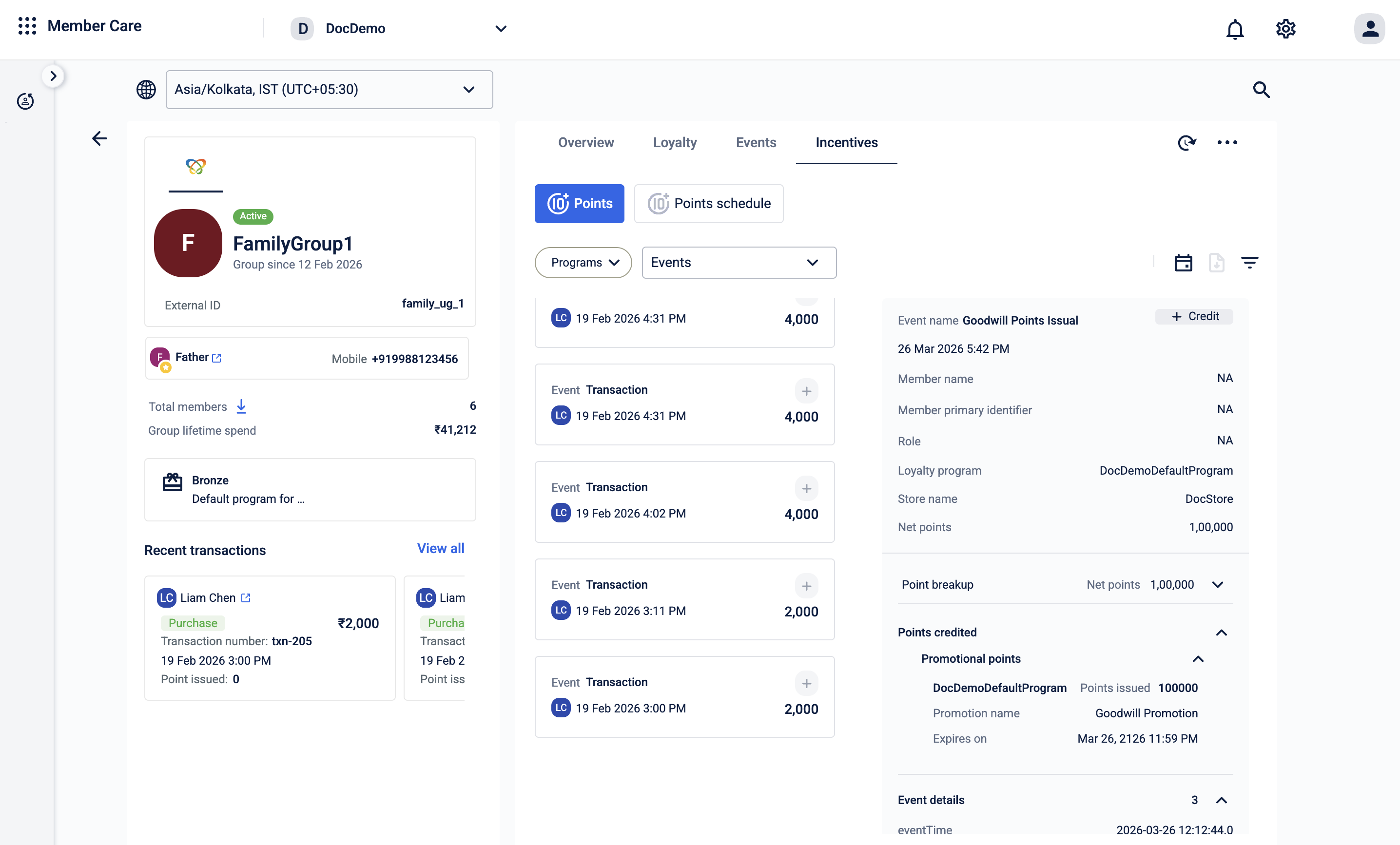 Every credit and debit on the group wallet is visible in the Incentives tab of the group view in Member Care. Each entry shows the member's name, their primary identifier, their role, the store where the event occurred, and the net points impact. Redemptions show the member who performed them.