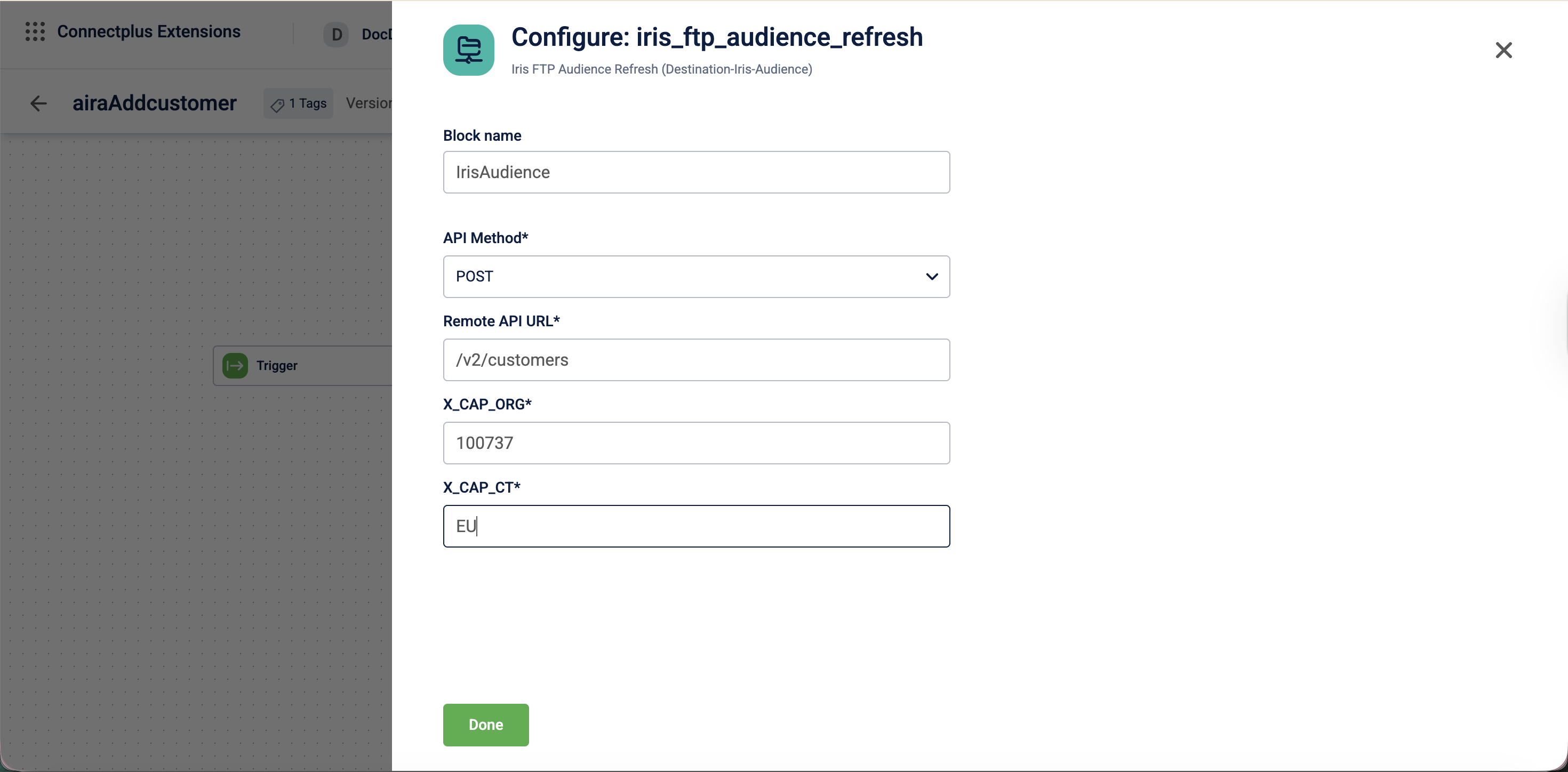 The iris_ftp_audience_refresh block sends audience data to the Iris FTP service as a destination block in a Connect+ dataflow. It calls a remote API endpoint using the specified HTTP method and passes the required Capillary organisation and cluster identifiers as headers to authenticate and route the request.