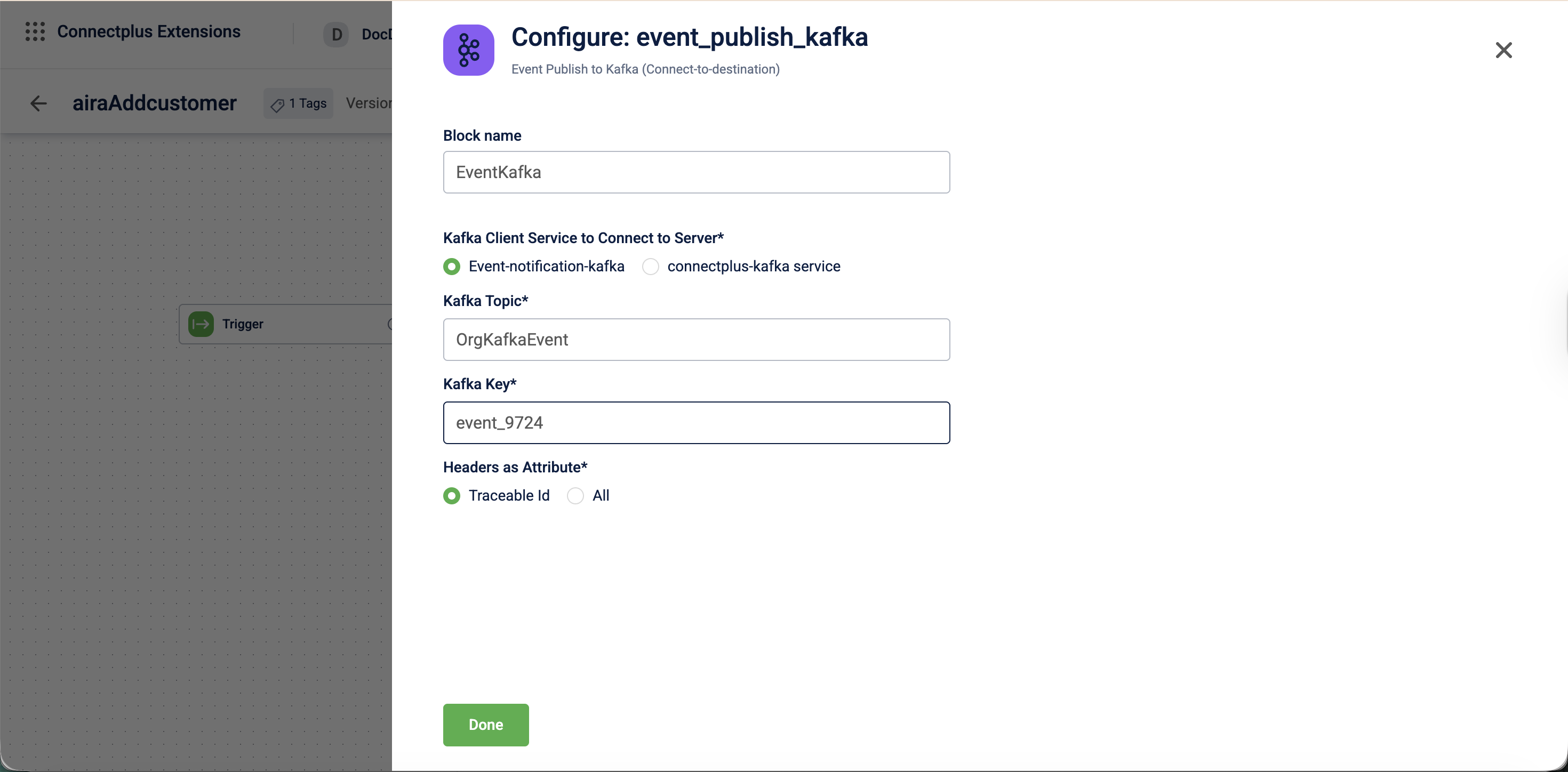 The event_publish_kafka block publishes event data to a Kafka topic as a destination block in a Connect+ dataflow. It connects to a specified Kafka service and writes data to a defined topic using a configured key. The block supports header attribute forwarding to enable traceability across downstream consumers.