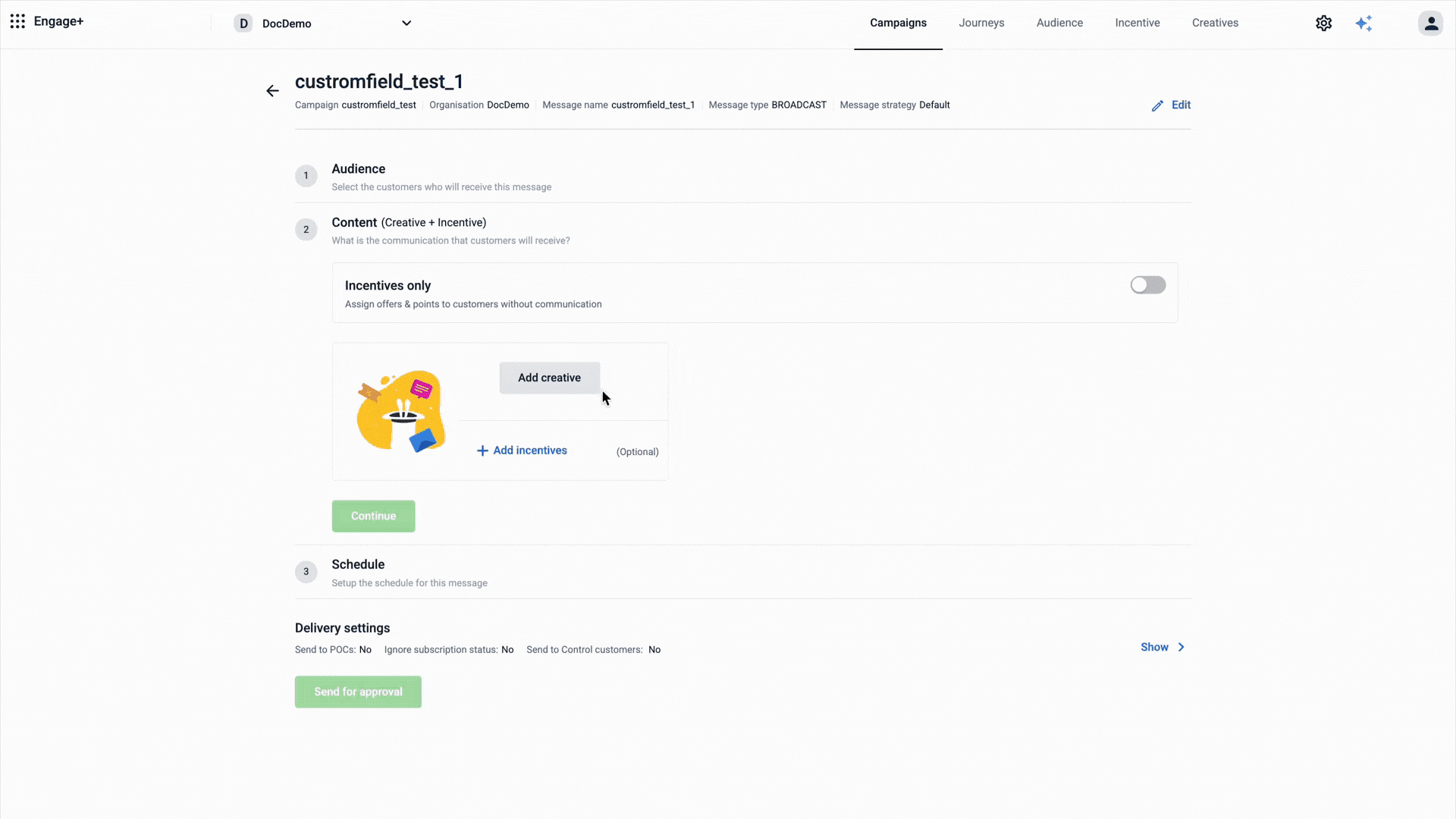 In the Content section, select Add Creative and choose the engagement channel for your communication.