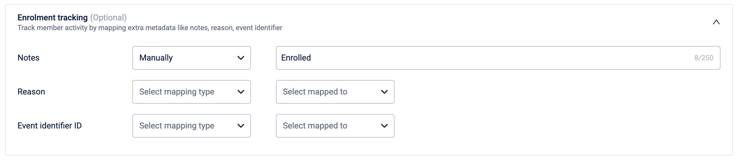 (Optional) Under Enrolment tracking, configure metadata to associate with this enrolment. For each field, select a mapping type from the first dropdown and then provide a value. You can map the following fields: Notes, Reason, and Event identifier ID.