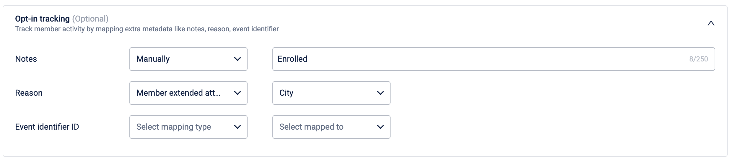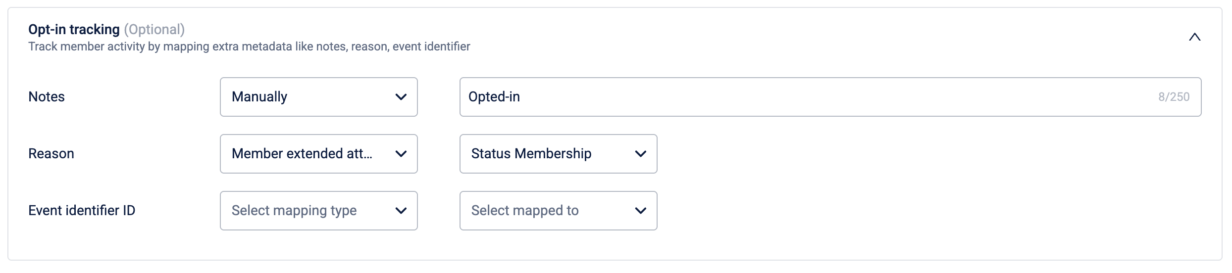 (Optional) Under Opt-in tracking, configure metadata to associate with this opt-in. For each field, select a mapping type from the first dropdown and then provide a value. You can map the following fields: Notes, Reason, and Event identifier ID.