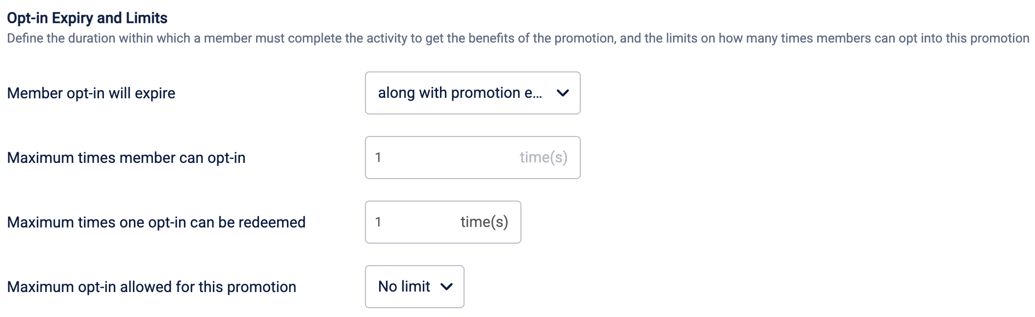 | Maximum times one opt-in can be redeemed | Defines how many times a member can complete the earning activity and receive benefits during a single opt-in period. For example, if a promotion offers bonus points for purchases, setting this to '3' means a member who has opted in can earn those bonus points on three separate purchases before their opt-in expires. When no opt-in is configured, this limit appears in the enrolment section. |