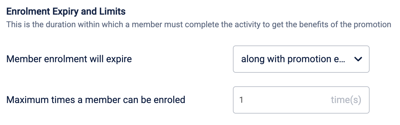 | Maximum times a member can be enrolled | Defines the total number of times an individual member can enrol in the loyalty promotion over the entire lifecycle. After exhausting the limit, a member can no longer enrol, even if their previous enrolment expires. For example, setting this to '1' ensures a member can participate only once. |