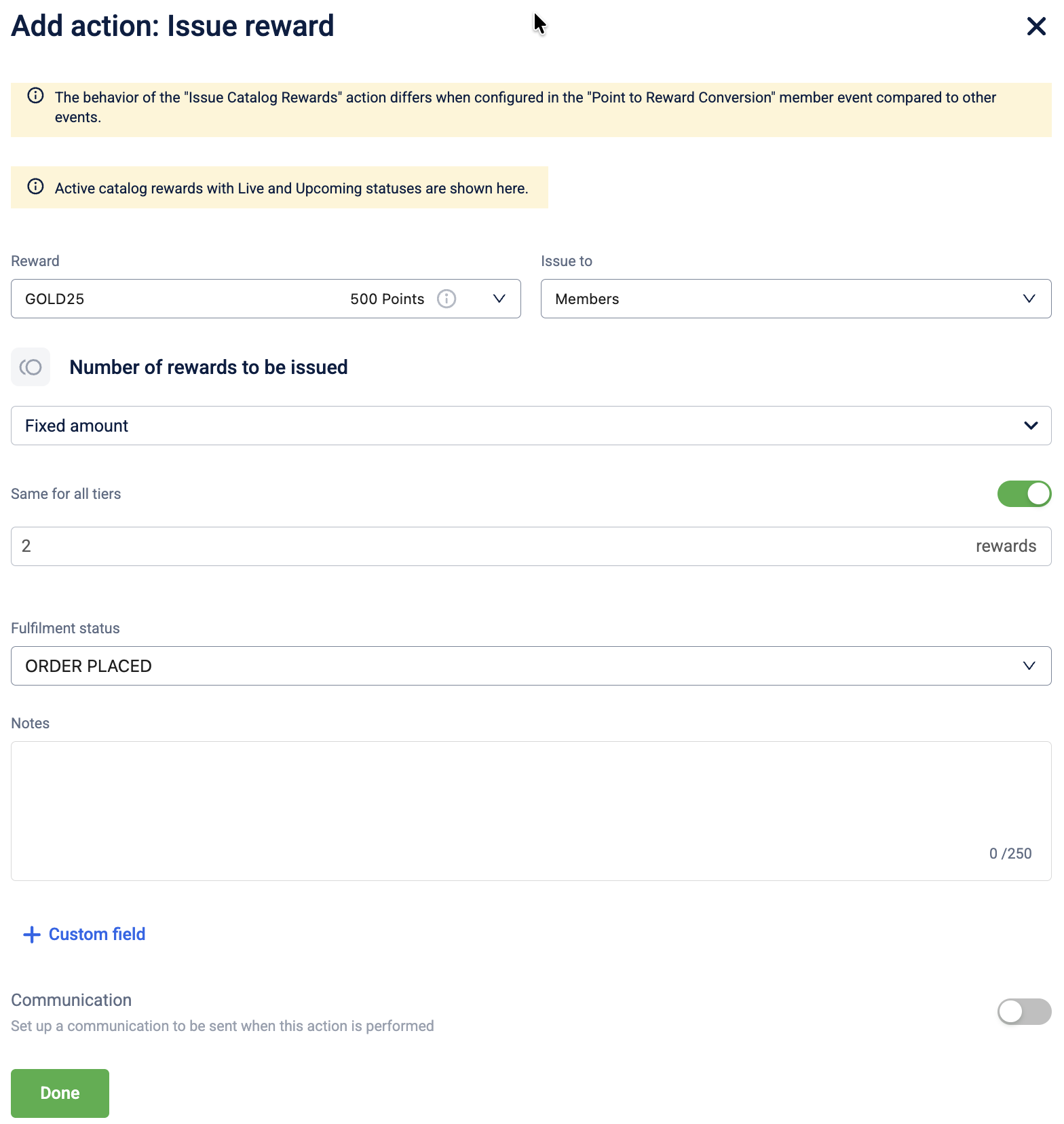Toggle Communication to ON to notify the customer when the reward is issued, and select the communication channels.