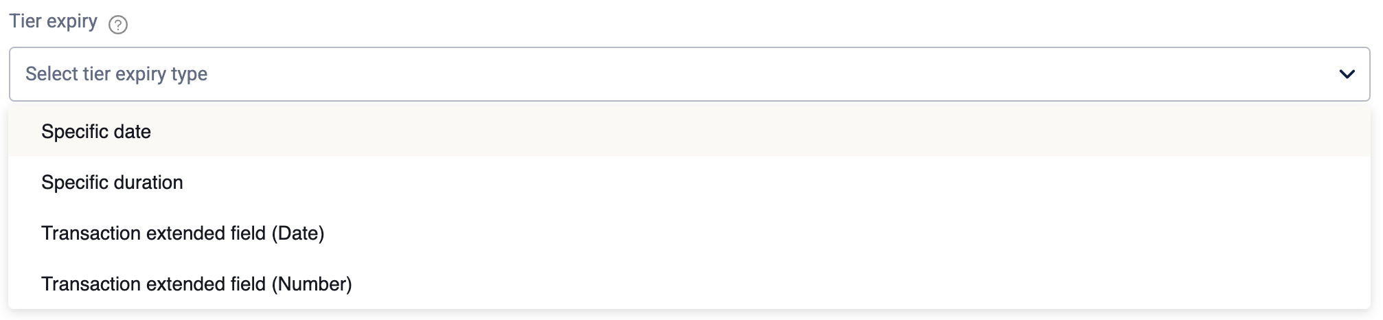 | Sets the expiration date based on a date value stored in a transaction-level extended field. The tier will expire a specified number of days or months after the date found in that field. | A hotel booking promotion grants 'VIP Status'. The expiration is configured to be 30 days after the date in the 'CheckOutDate' transaction extended field. If a customer's check-out date is June 15th, their VIP status will expire on July 15th. |