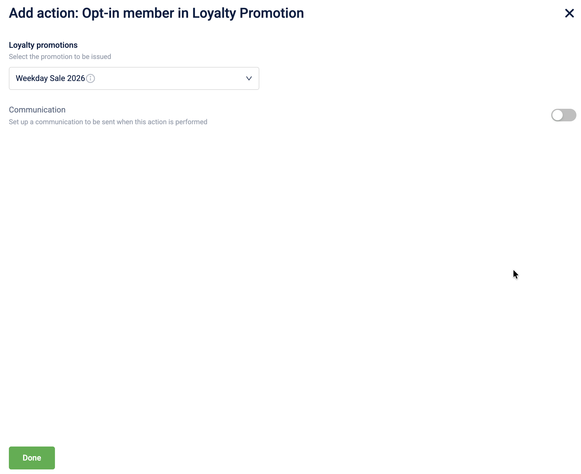 The opt-in member in loyalty promotion action lets you opt-in a member into a loyalty promotion.