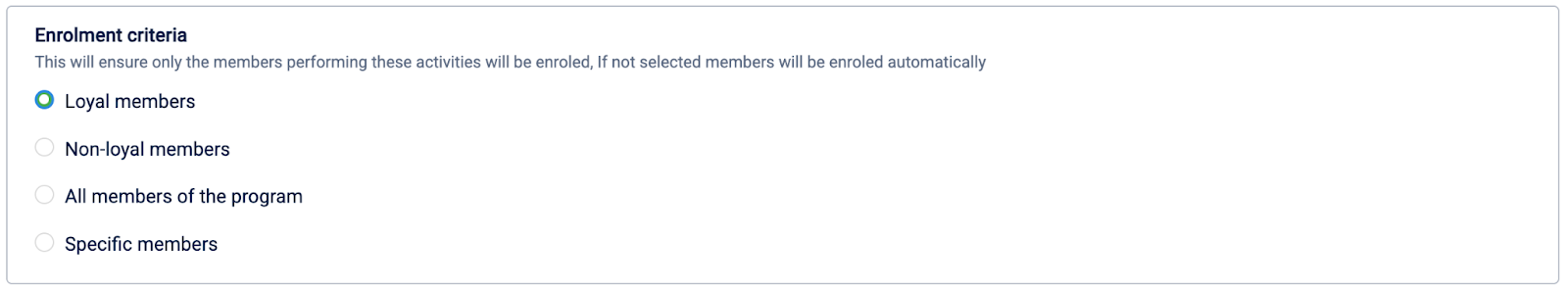 Enrolment: This is the first step that defines the broad audience for the promotion. You can target all members of your loyalty program or target specific members based on predefined audience groups, their completion of a qualifying activity, or an external trigger via the enrol API call.