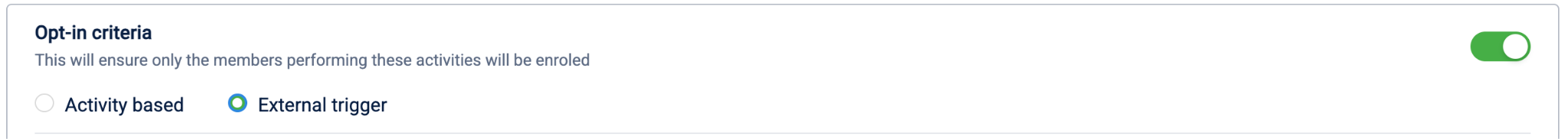 Opt-in: This is an optional second step that requires an enrolled member to perform an explicit action to actively participate. This ensures that only engaged members who have consciously chosen to join can earn rewards. An opt-in is triggered based on the completion of a qualifying activity or an external trigger via the opt-in API call.