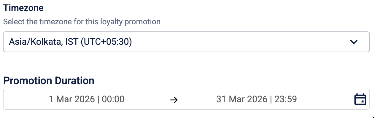 The duration defines the specific timeframe during which a promotion is active. Here, you can define the start and end dates and times for the loyalty promotion. You can also define a timezone for the duration.