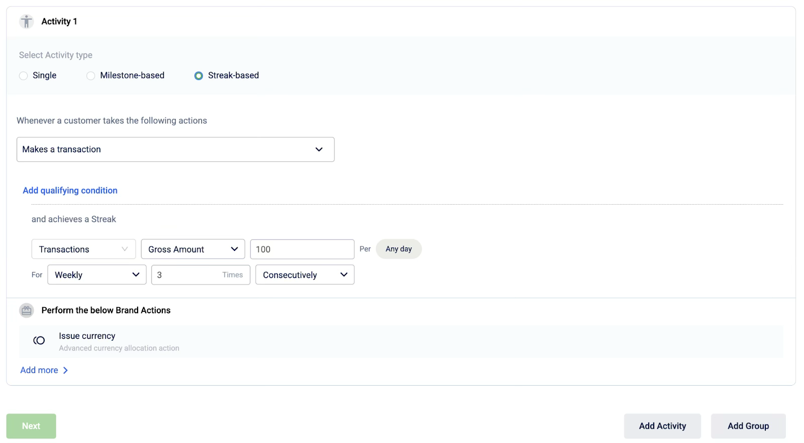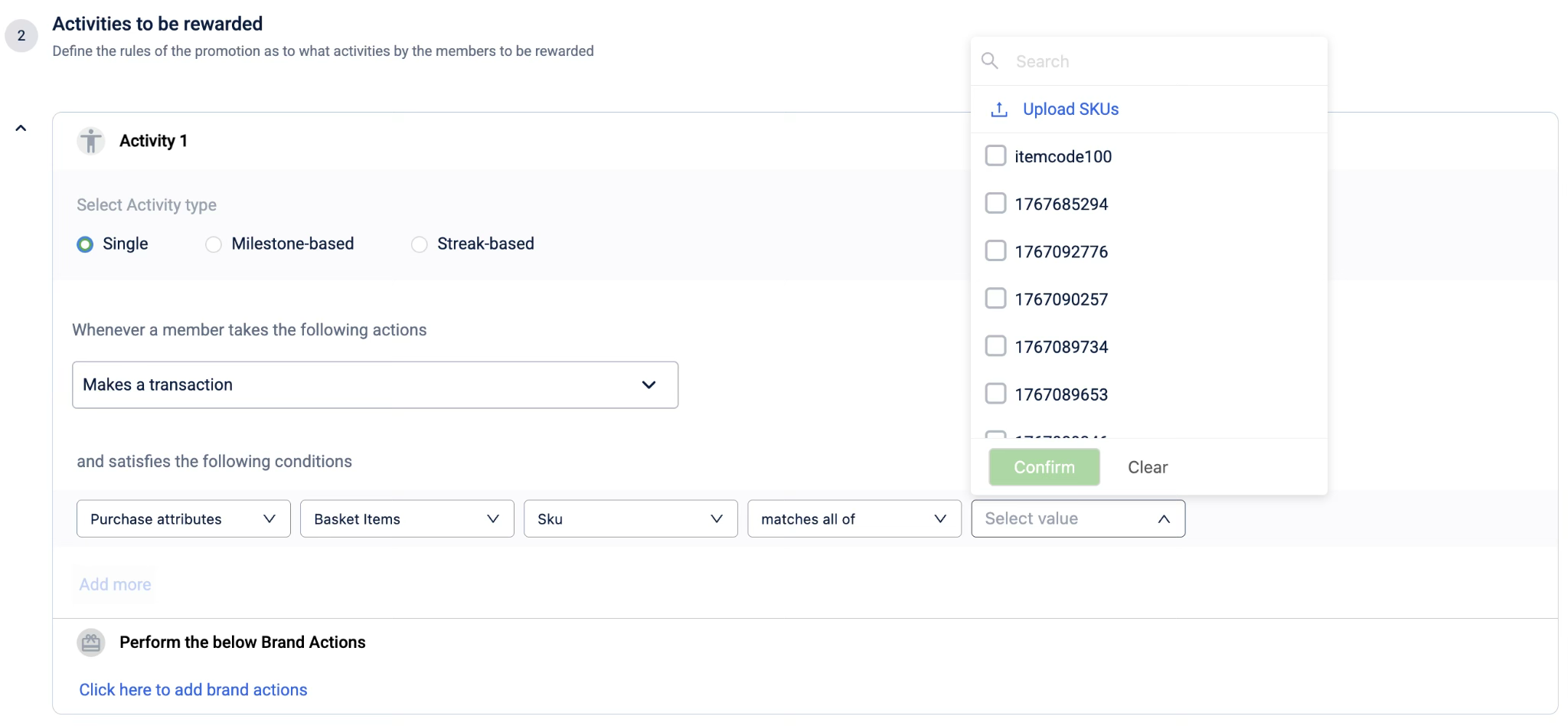 This is the core of your promotion. Here, you define what actions customers must take to earn rewards. You can define an individual activity or a group of activities. You can add up to 25 individual activities and up to 10 groups and sub-activities in a group, per loyalty promotion. You can add up to 10 brand actions per activity.