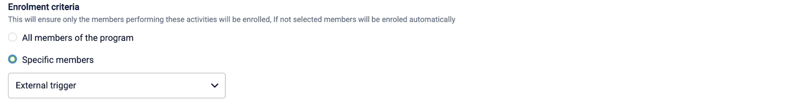 Select Specific members, and then select External trigger from the dropdown to enrol members through the enrol API