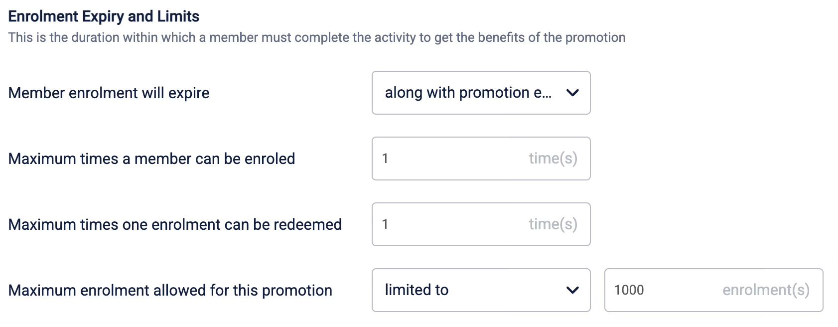 Define the expiration and limits for enrolment to set clear boundaries on customer participation. These controls are essential for managing the duration of an individual's enrolment, limiting how many times they can join, and capping the total number of participants for the entire promotion.