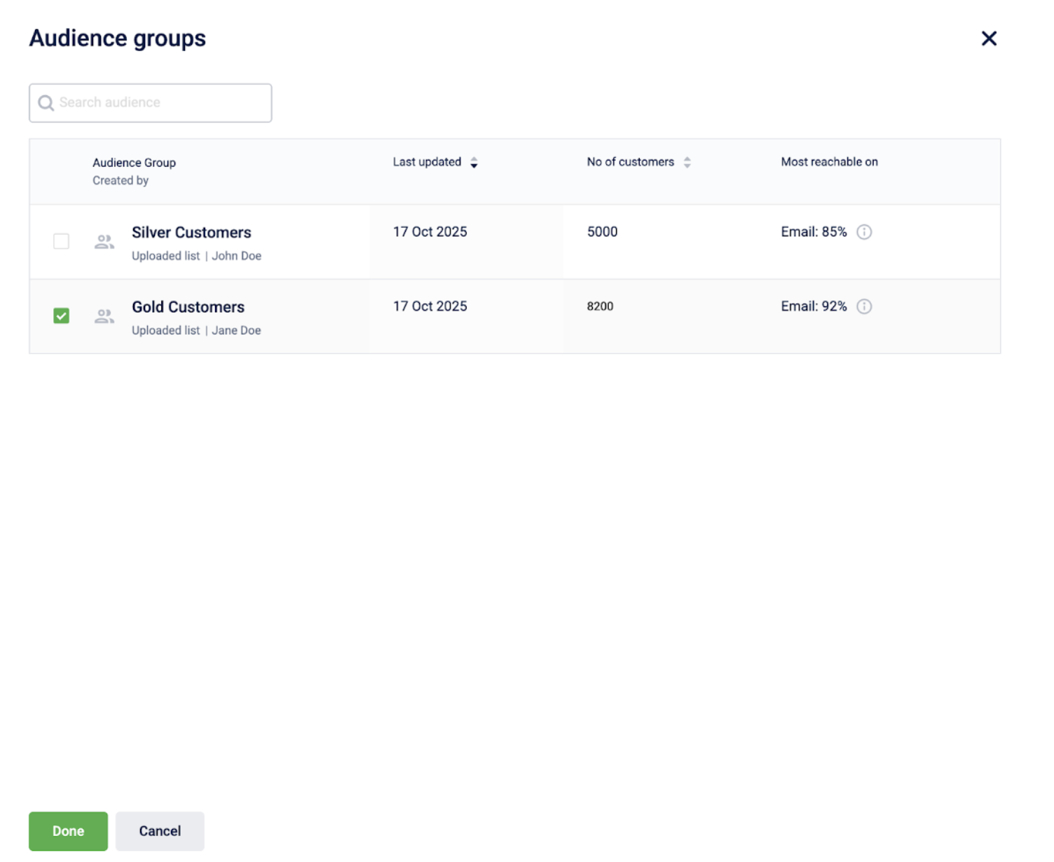 | Audience group | Target a known, predefined customer segment, such as "Gold Tier Members." |