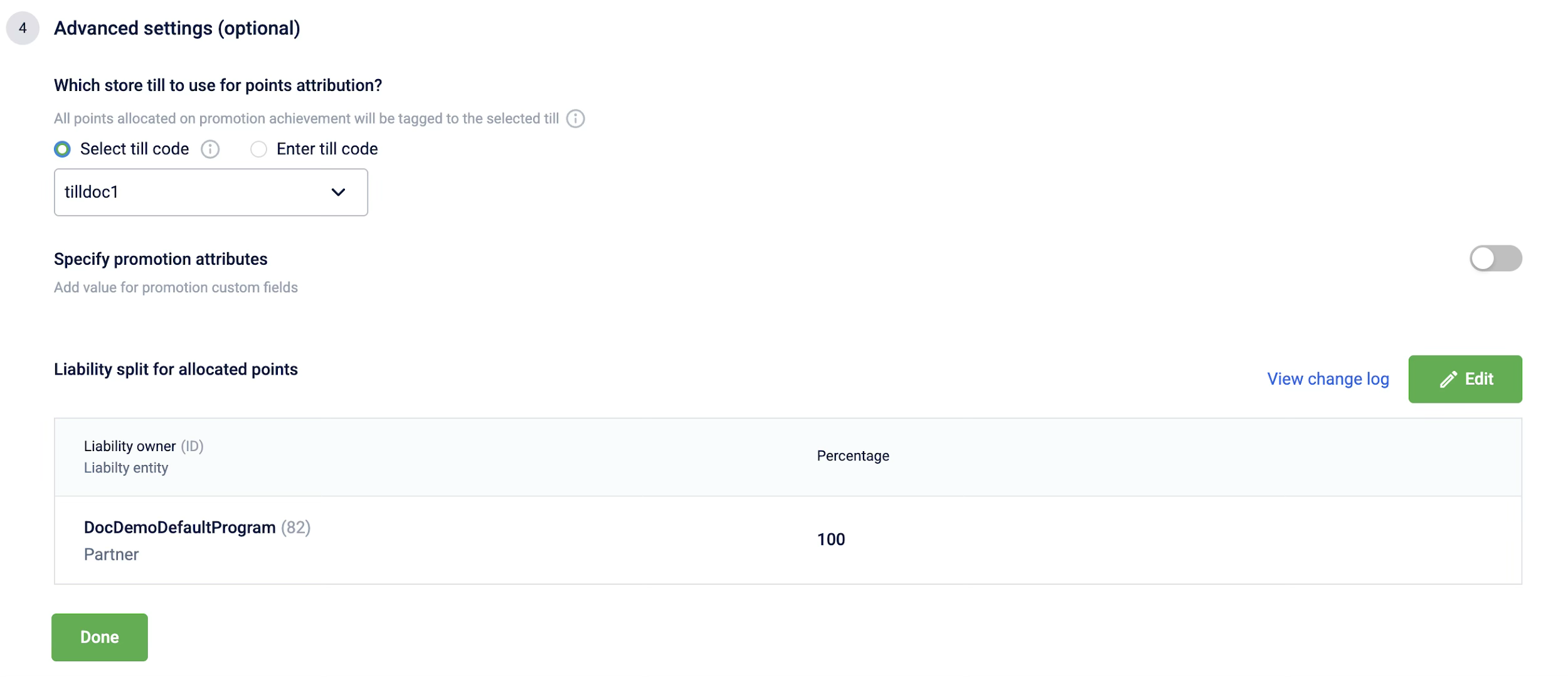 - Select Edit to define the liability split for the loyalty promotion, select Add liability owner, and select a new liability partner from the dropdown. This feature serves primarily as metadata for accounting and reconciliation purposes and does not affect the customer's experience or the logic of the promotion itself.