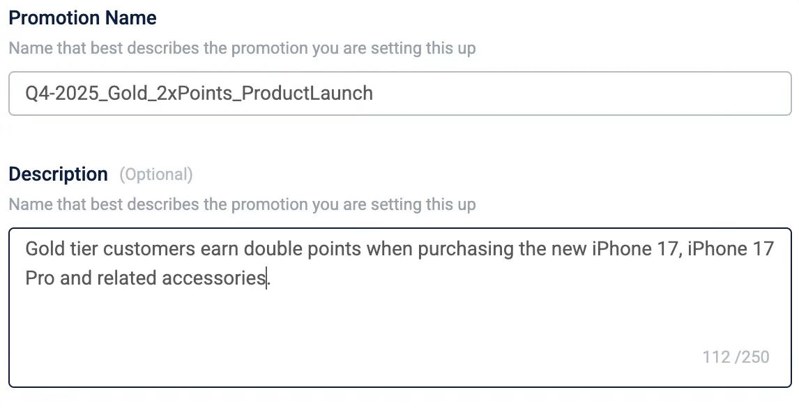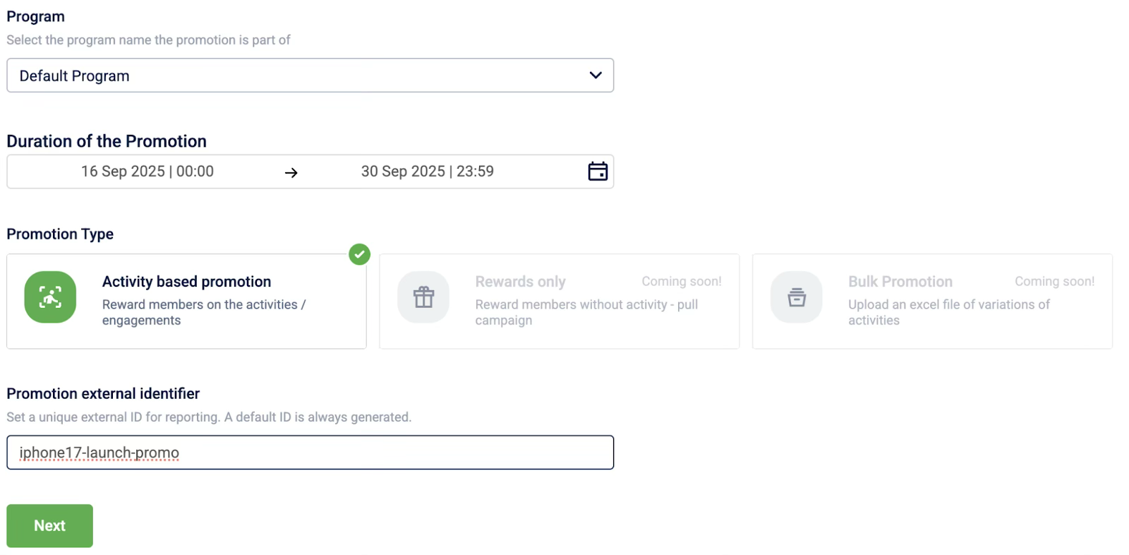 Start by defining the promotion's basic details, such as its name, description, duration, and the loyalty program it belongs to.