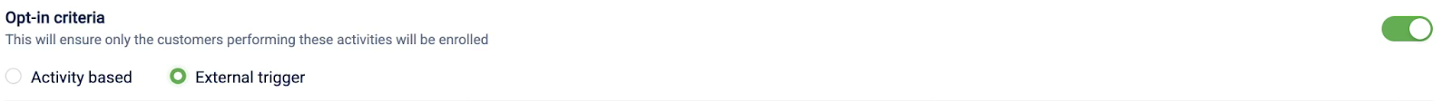 | External trigger | Manage enrolment through the opt-in API that can be initiated from various sources, such as a customer journey, a mobile app promotion, or a third-party CRM. |