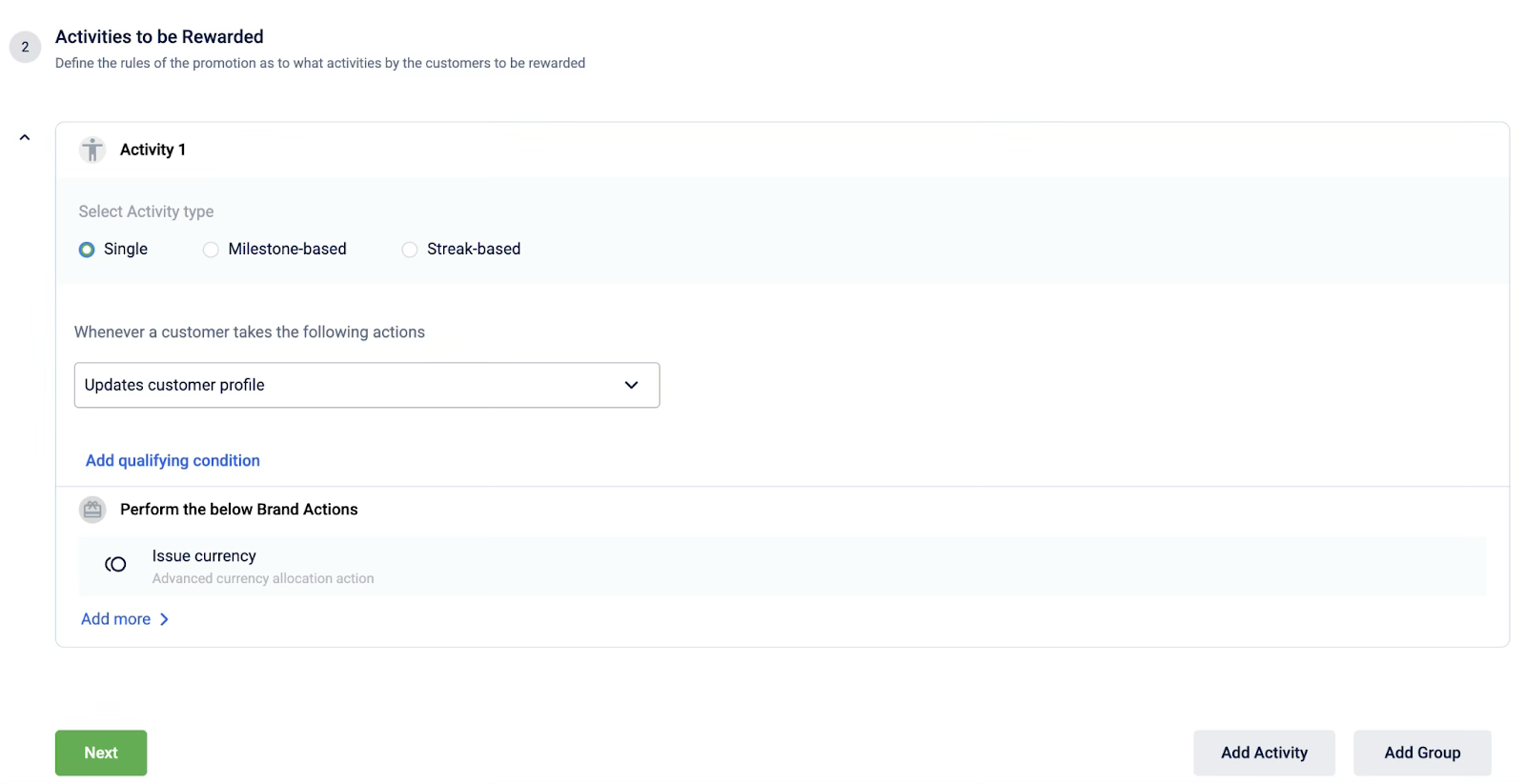 Choose this for straightforward promotions where a reward is tied to a single customer action. First, decide which type of activity best fits your promotion's goal: