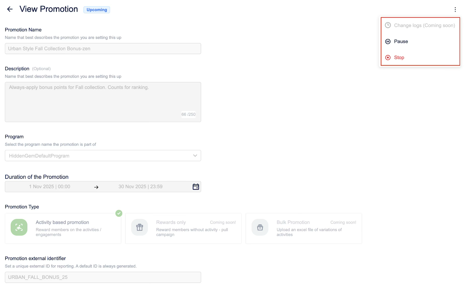 Select the three-dot menu on the top right and select Pause to pause a live loyalty promotion or Stop to end a live loyalty promotion.