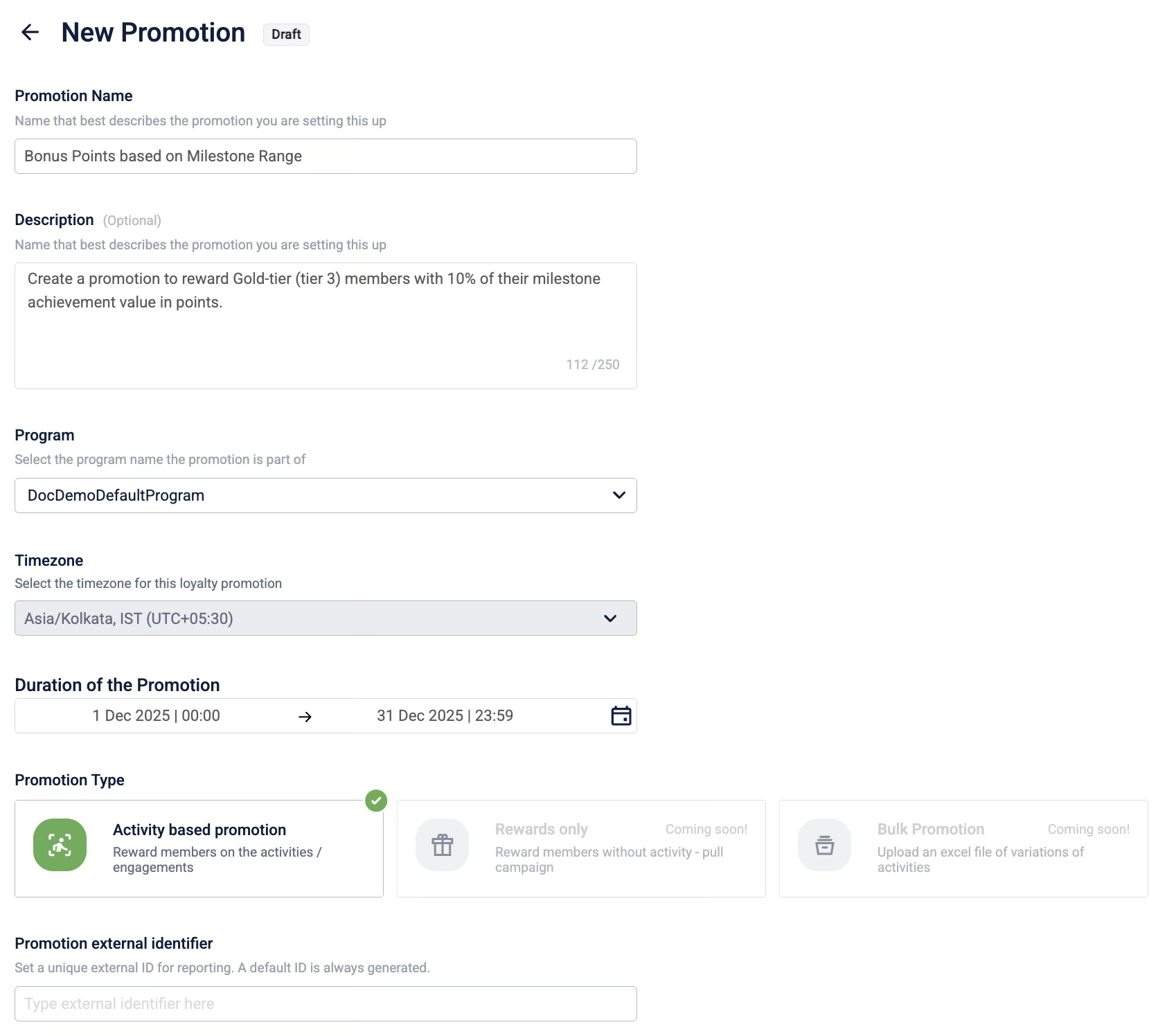 Description: Create a promotion to reward Gold-tier (tier 3) members with 10% of their milestone achievement value in points. Customers can spend up to $1000 and make up to five transactions. Points are issued once the customer makes three transactions or achieves the milestone. The promotion is available only for specific products and does not include gift cards.