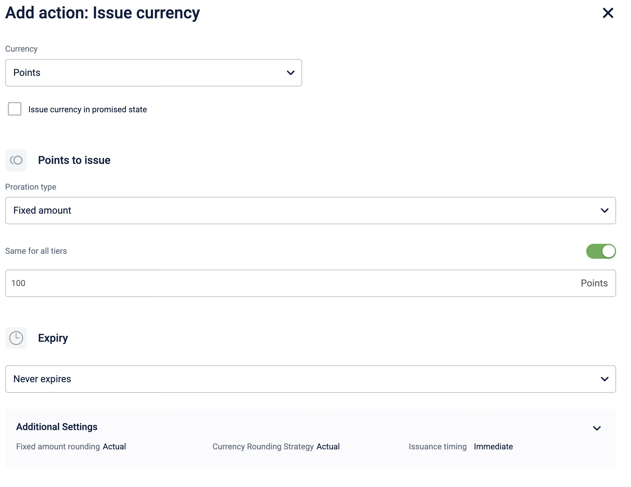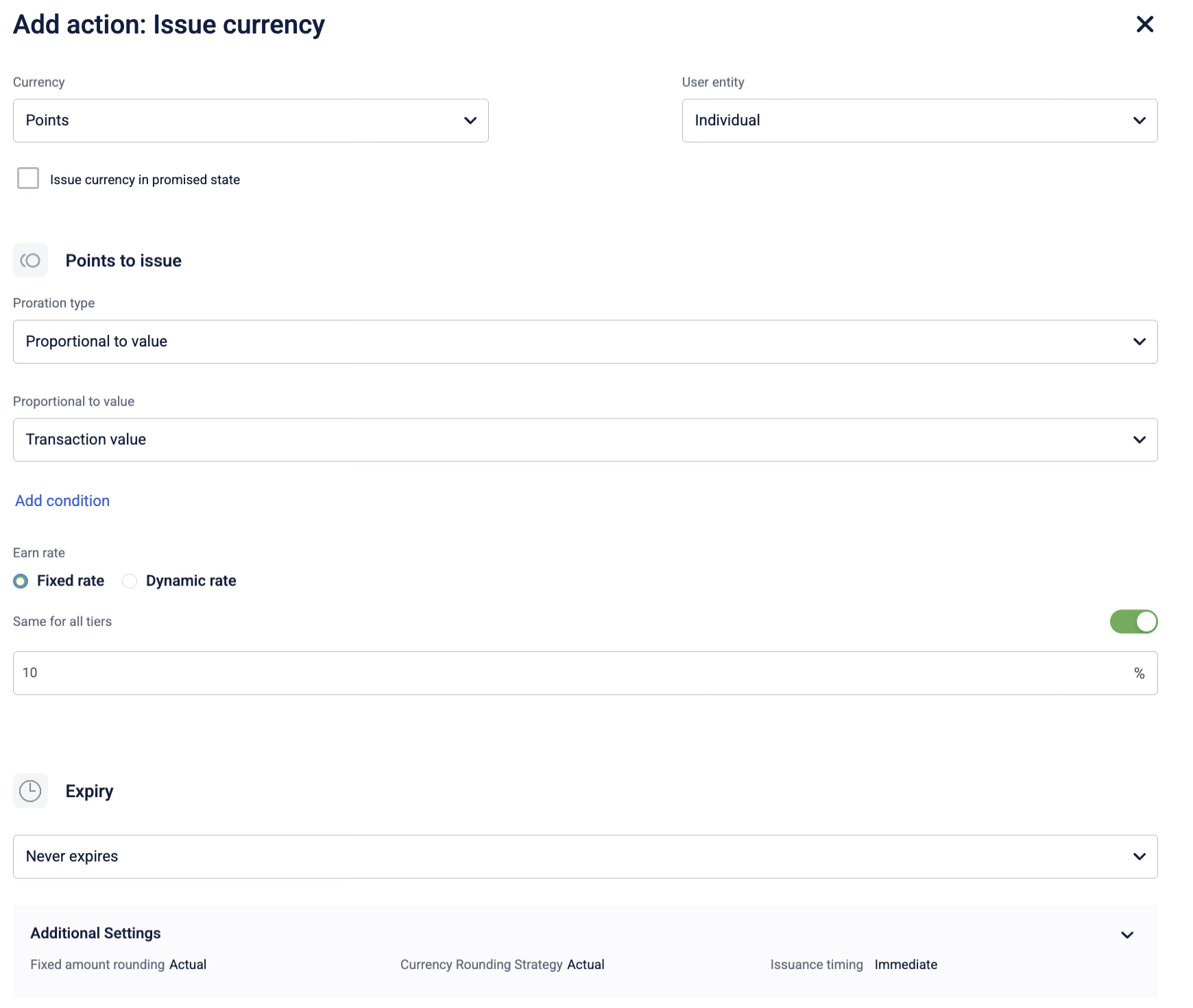 Select + Add brand actions and select Issue Currency, and configure the currency to issue.