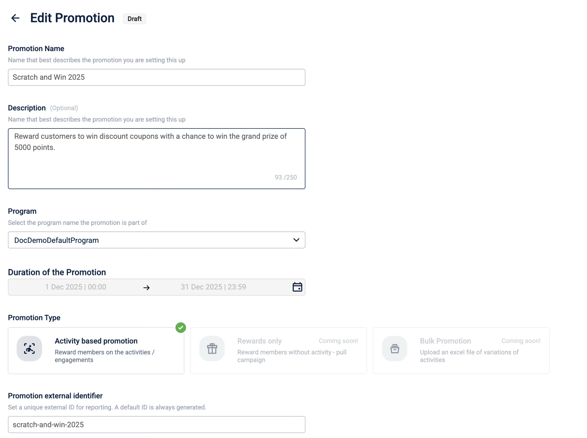 Description: Create a promotion to reward customers for winning discount coupons with a chance to win a grand prize of 5000 points. To be eligible for the sweepstakes, the customer must make a minimum purchase $50 in the last three months and opt in for the sweepstakes on the mobile app or website. The sweepstakes are limited to only the first 10,000 customers.