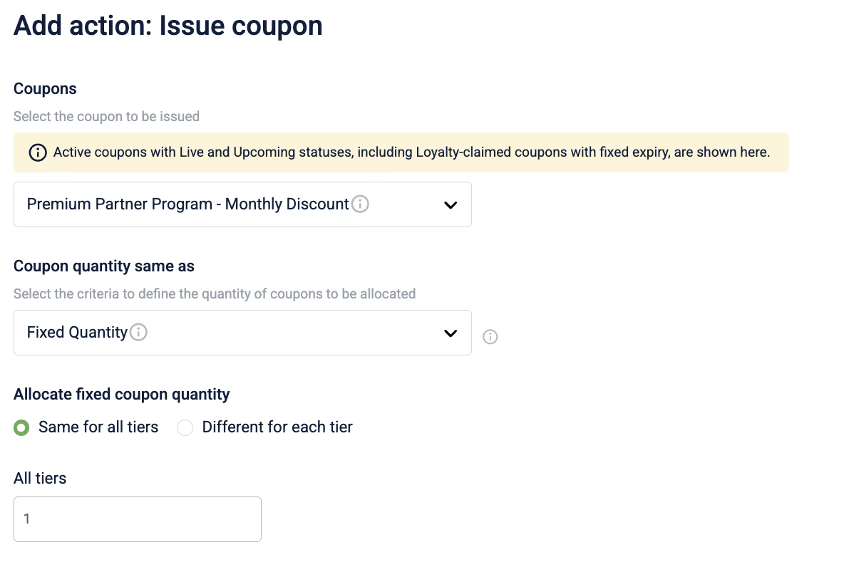 - Select + Add brand actions and select Issue Coupon, and configure the coupon to be issued.