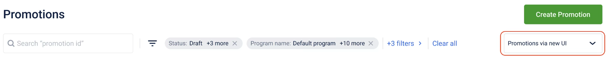 To view loyalty promotions created on the old UI, select Promotions via new UI from the drop-down menu.