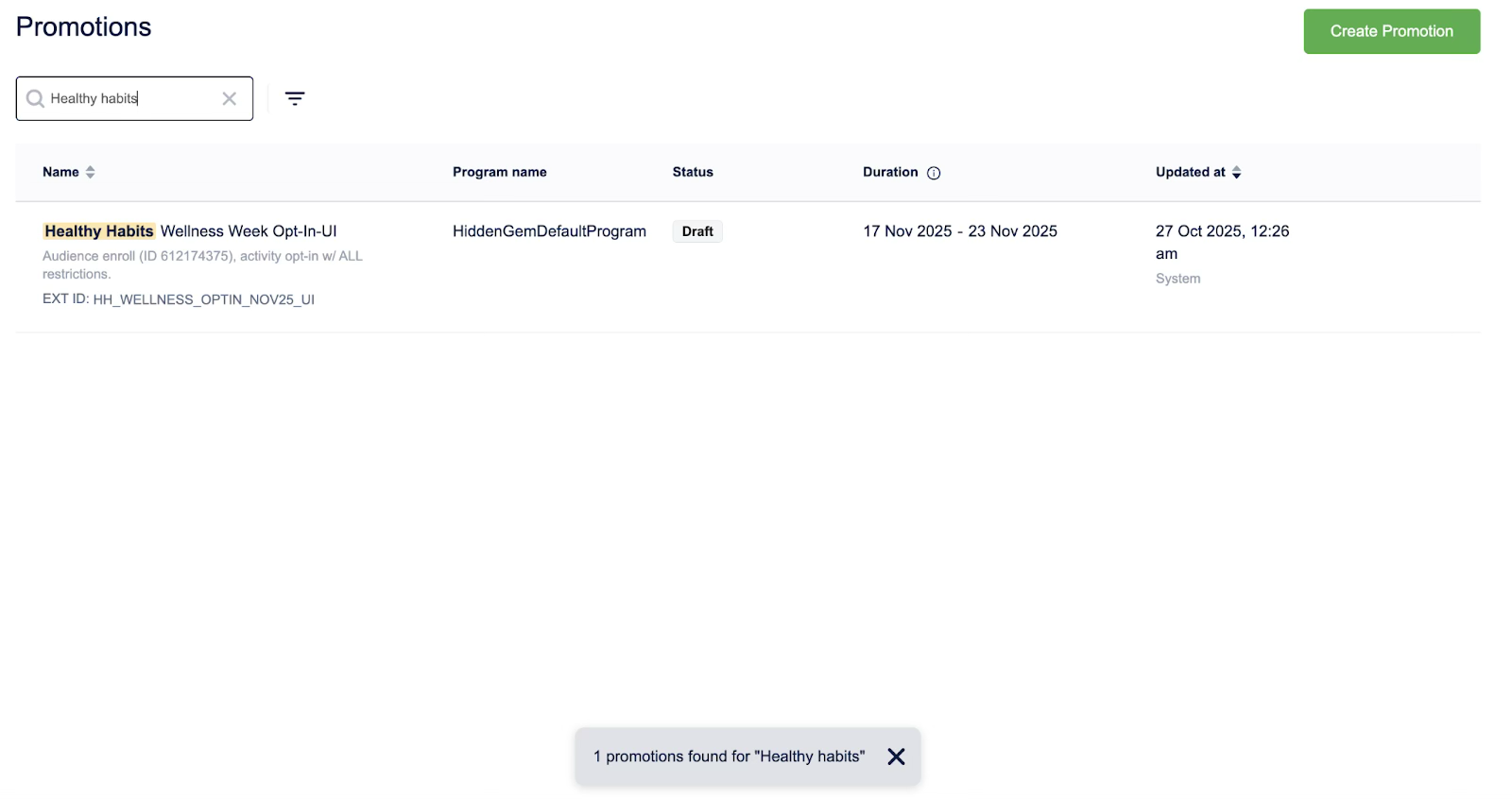 Use the search bar to find a specific promotion. You can search by description, promotion ID, or external identifier in addition to the promotion name.
