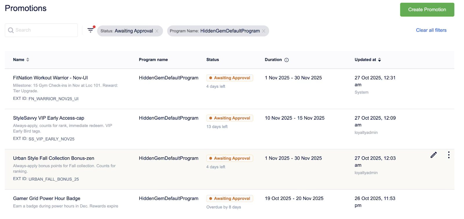 The Promotions dashboard is the hub for managing your loyalty promotions. From this page, you can quickly see each promotion's loyalty program, status (such as Live or Awaiting Approval), scheduled duration, and last modification date.