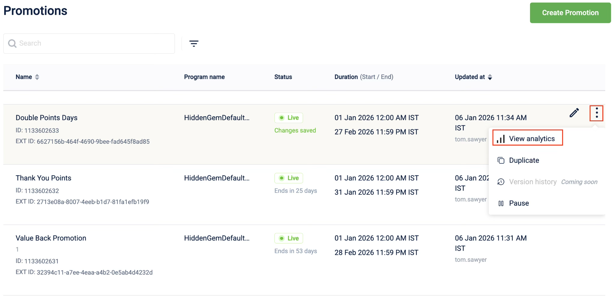 NoteThe list view only shows the promotions created on the loyalty promotions UI.