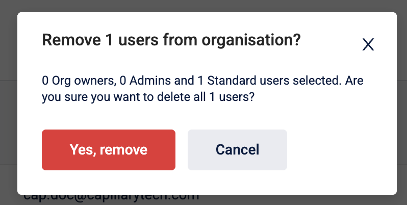 You can remove users individually or multiple users together by selecting 1 or many user(s) from the user list available on UI. To remove it, on the user listing page, select the user and click Remove from organization.