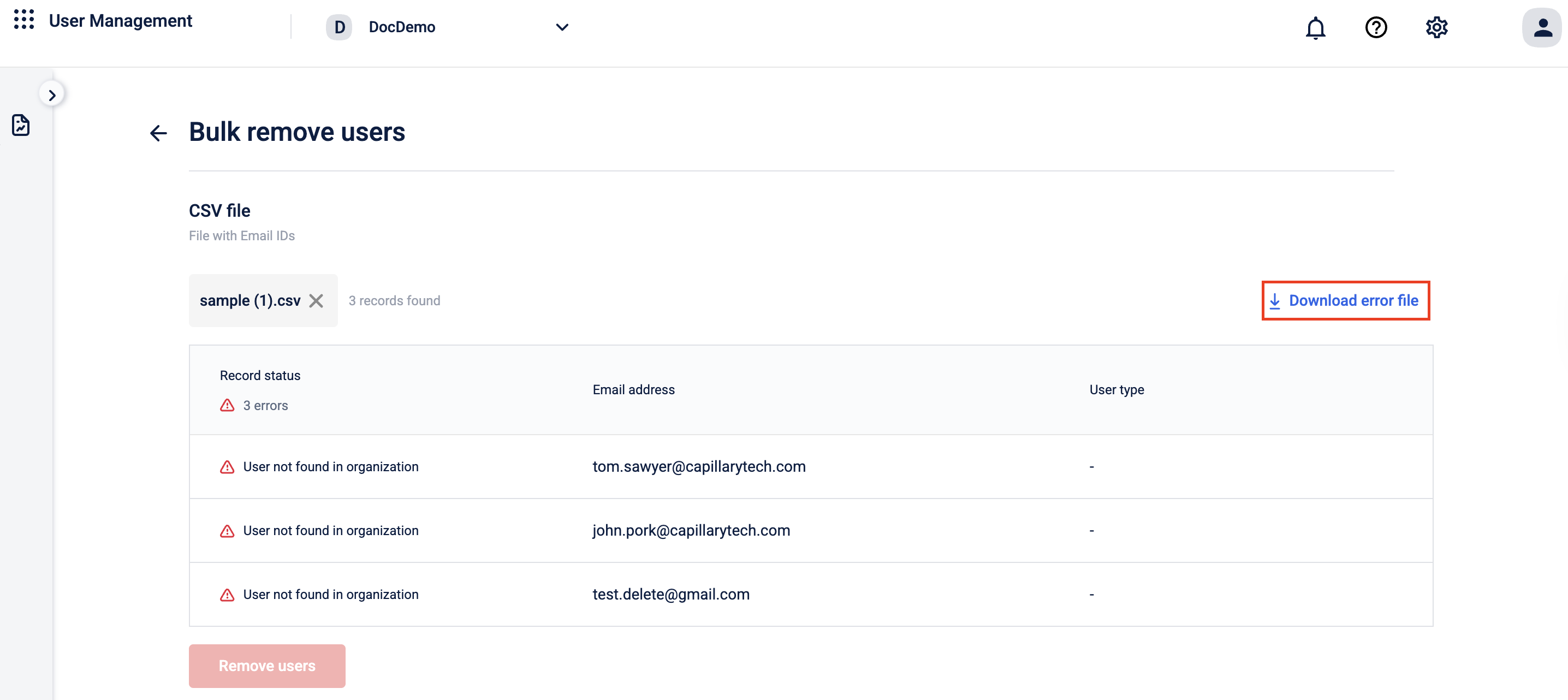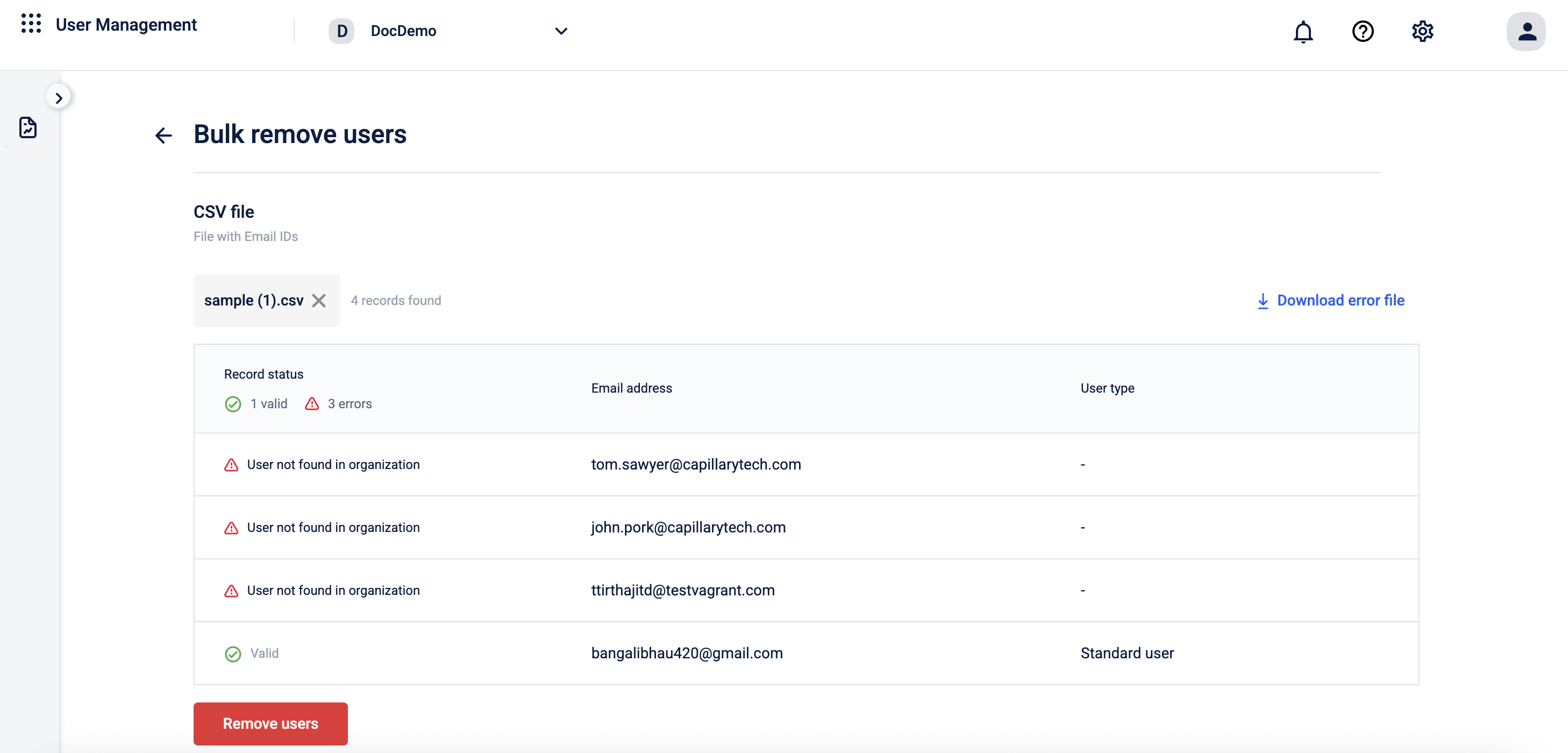 - No duplicate entries - The file must not contain duplicate entries of the email IDs. If there are any duplicate entries, the validation fails, and no users are deleted.