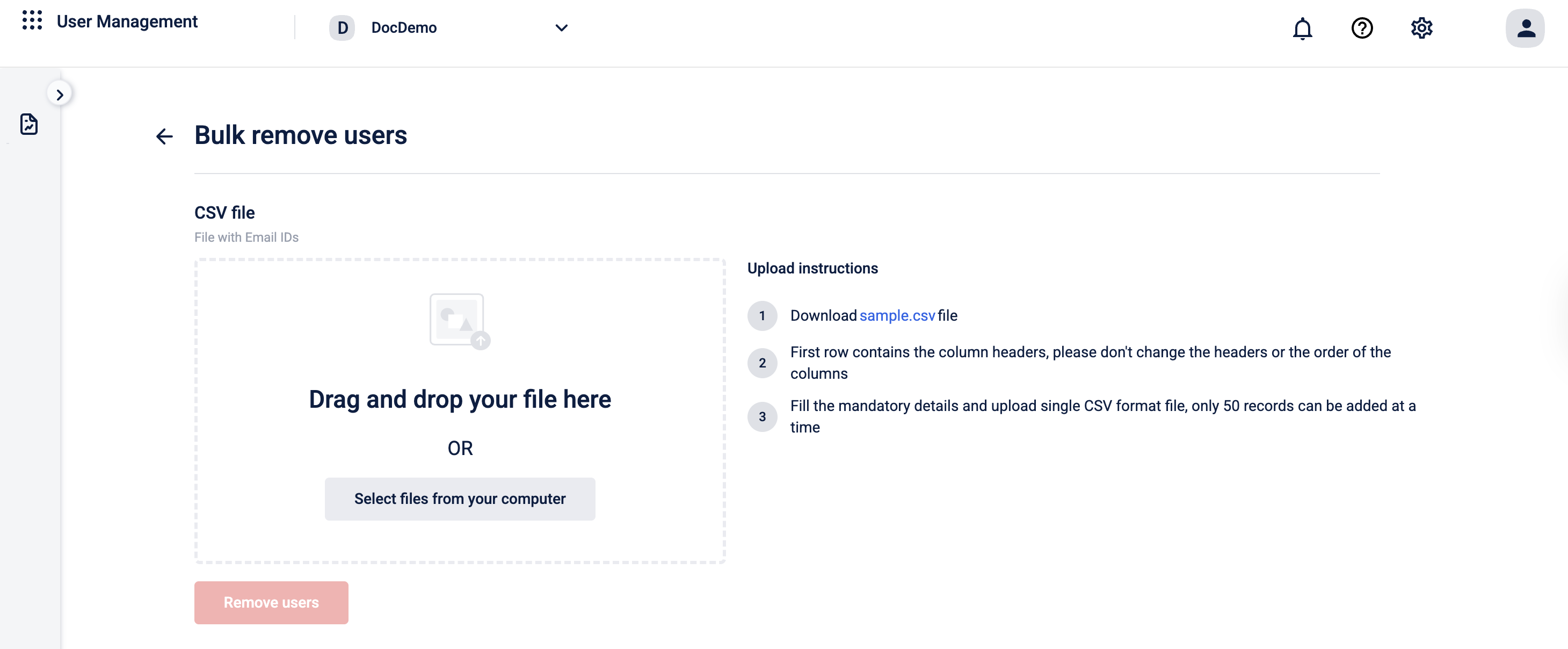 You can delete multiple users at once by uploading a CSV file from the User Management UI. The CSV file contains the email IDs of the users to be deleted. Before any users are deleted, the system validates the uploaded file and each record to ensure that only the intended users are removed.