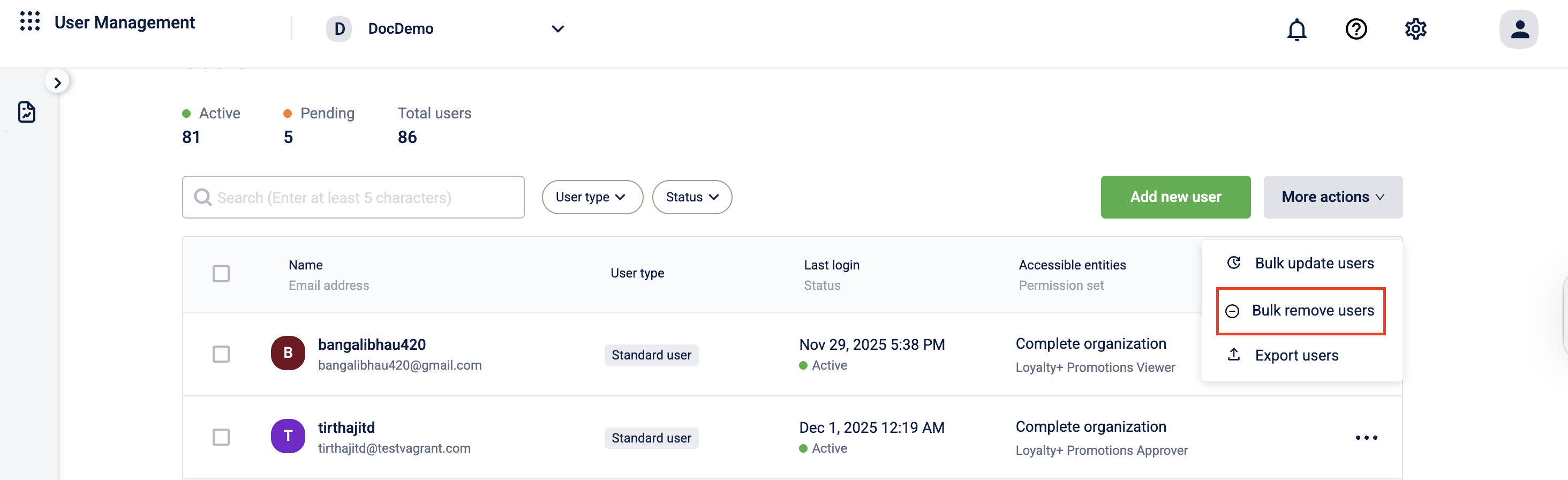 To delete users in bulk, perform the following: