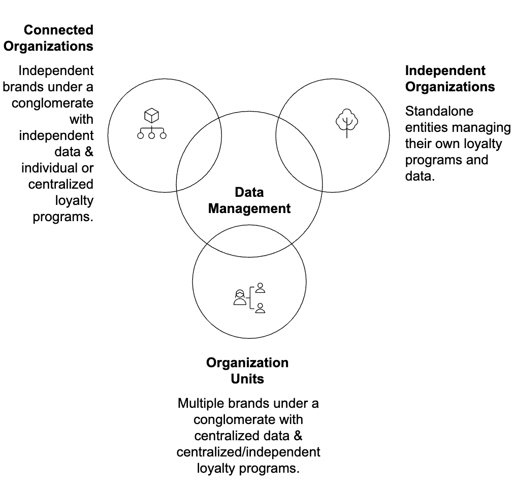 | Organization Units (OUs) within a single organization | A single organization set up for a conglomerate, where each brand is mapped to a dedicated OU. | For conglomerates that want to manage loyalty operations across all their brands centrally. |