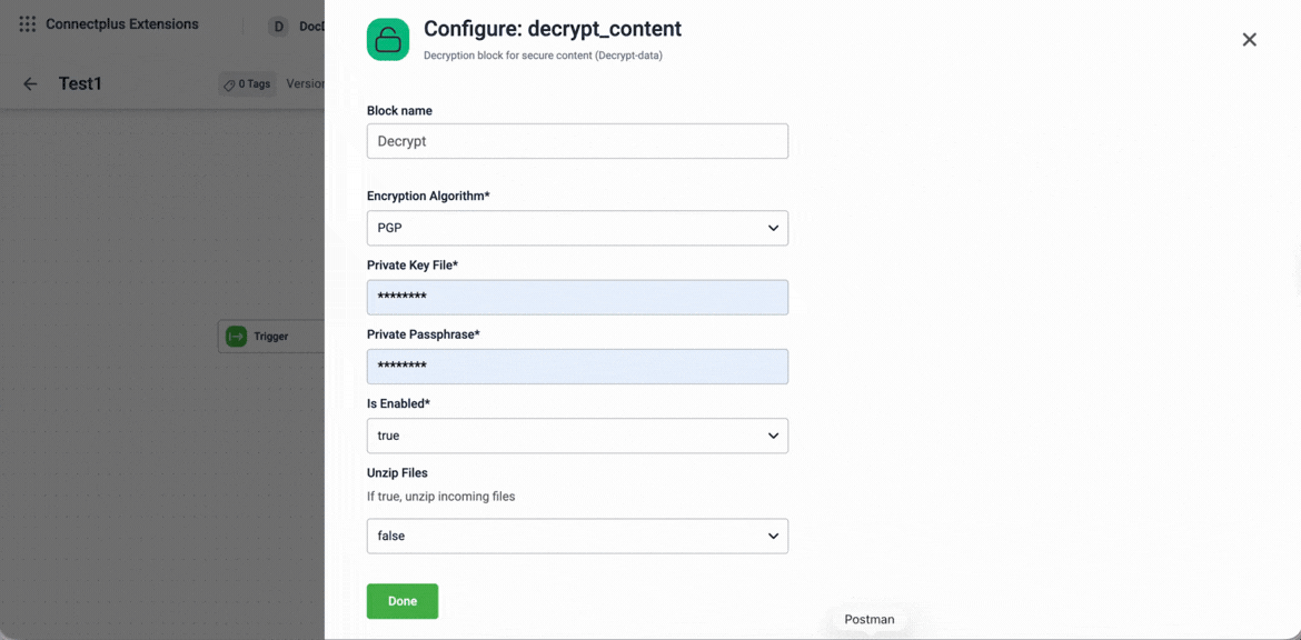 The decrypt_content block decrypts encrypted source files before they are processed downstream. It acts as an optional transformation block in a Connect+ dataflow, sitting between the source and transformation blocks to handle secure content. The block supports PGP-based decryption using a private key and passphrase, and can be enabled or disabled without removing it from the dataflow.