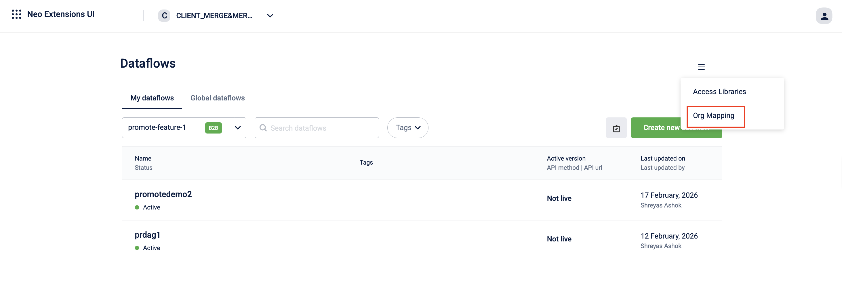 The Promote feature in Neo allows you to push an approved or live dataflow from one organization to another within the same cluster. Unlike the copy-paste feature in aiRA Coder, Promote is built for controlled deployment; it checks permissions in both the source and target organizations, enforces organization type hierarchy, and transfers the complete dataflow configuration.