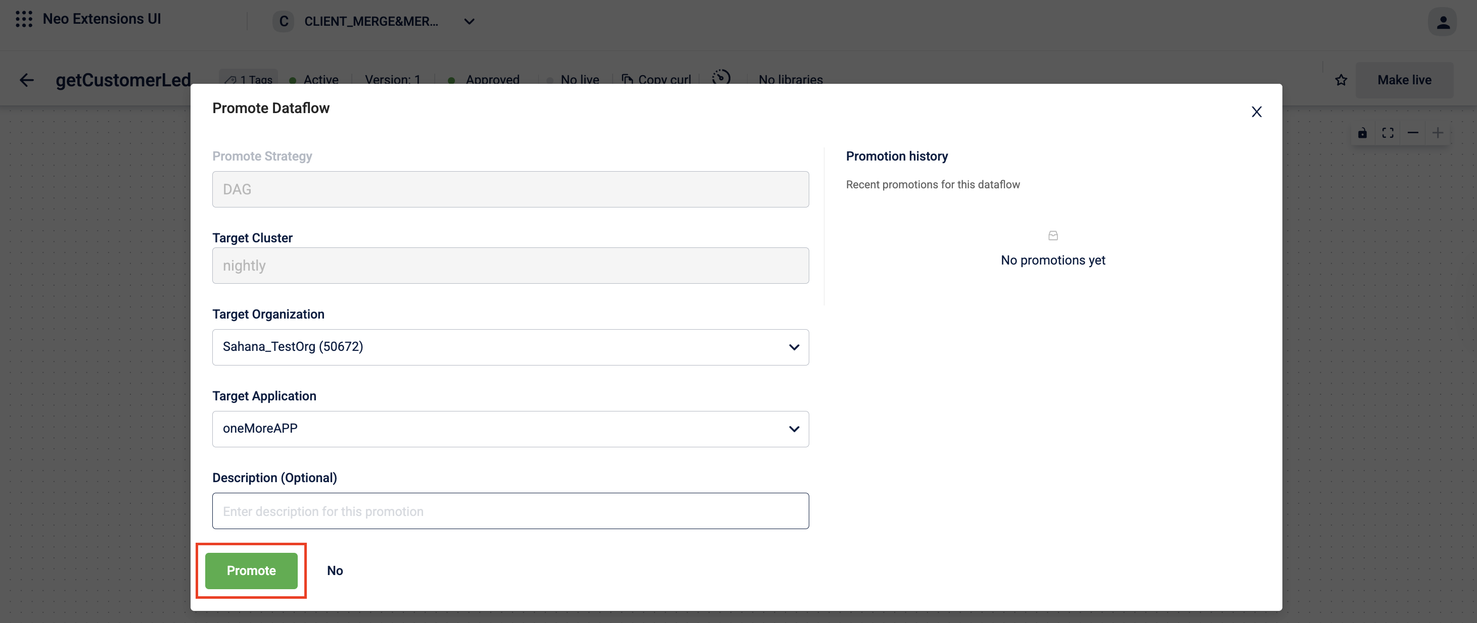 You can promote a dataflow when the version is in Approved or Live status, the source and target organizations are mapped, a custom application exists in the target organization, and the user has the Neo Promote permission in both organizations.