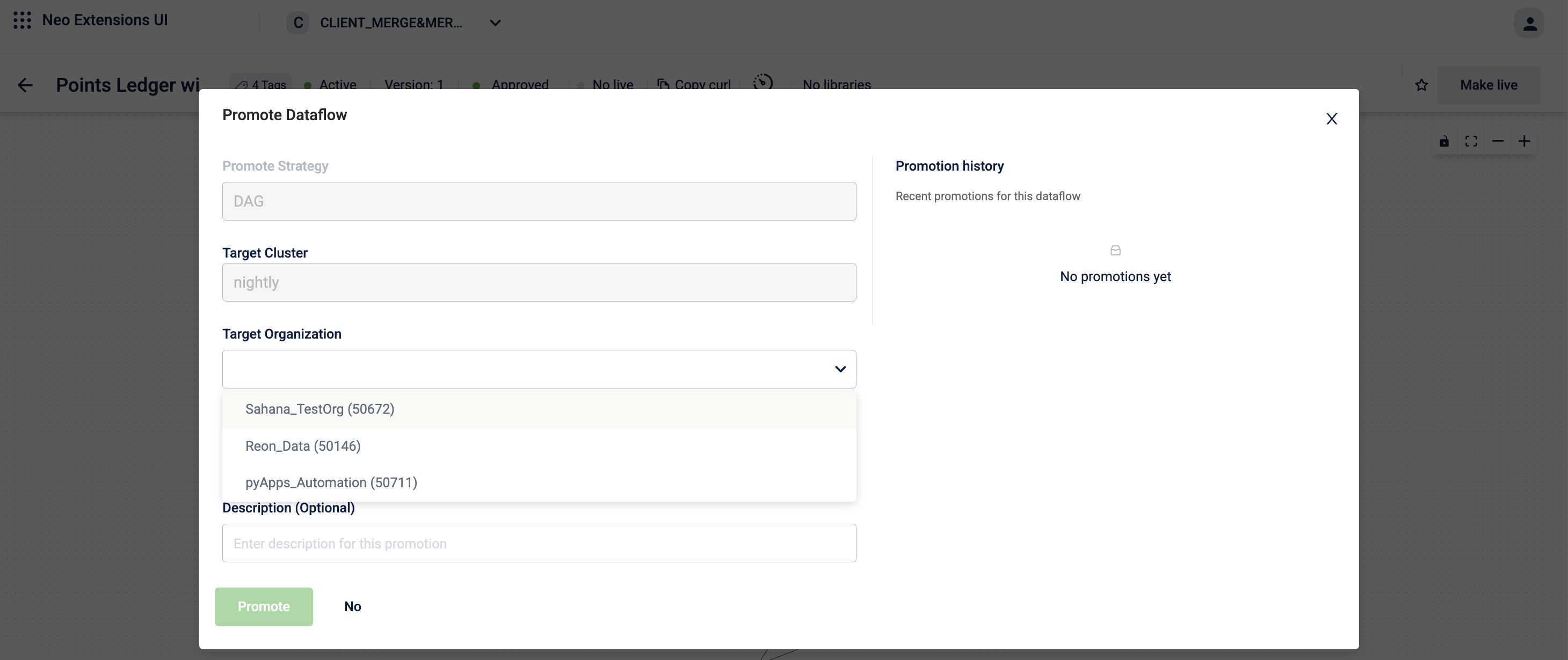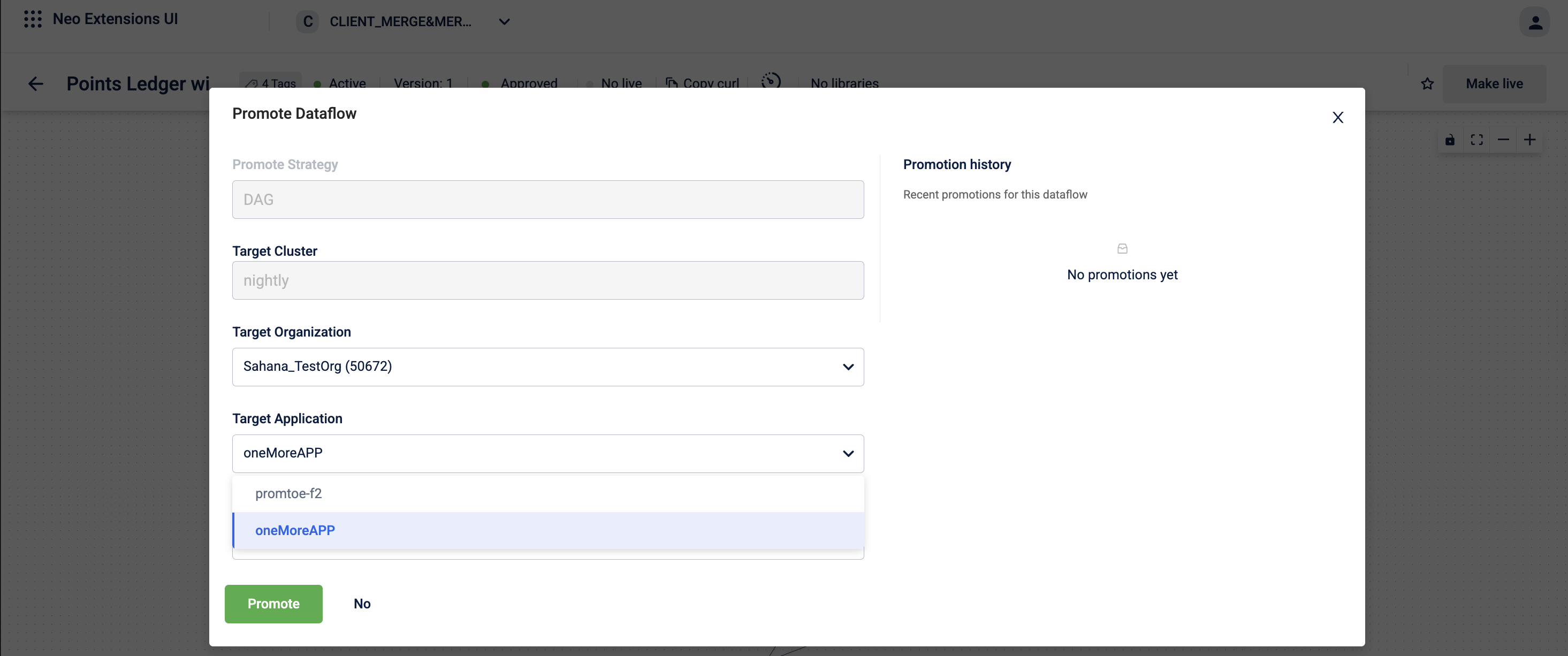 - If the target organization already contains a dataflow with the same trigger URL and HTTP method, Neo automatically routes the promotion to the application that already contains that dataflow. You cannot select a different application in this case.
